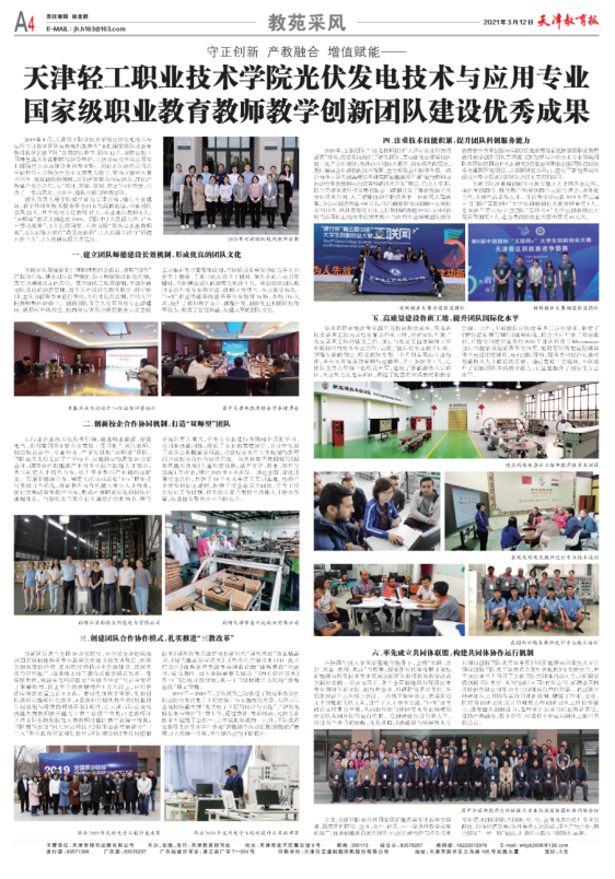 2021年3月12日,天津教育报以《守正创新 产教融合 增值赋能——新利18平台光伏发电技术与应用专业国家级职业教育教师教学创新团队建设优秀成果》为标题进行了整版报道,为我院双高校建设项目,“十四五”专业群发展奠定了良好的基础,发挥了国家创新团队标杆示范作用。2021年,创新团队继续发扬“三牛”精神,向中国共产党建党100周年献礼。全文如下:(https://mp.weixin.qq.com/s/pn_RV_7dweIdyC2e04x0Pw)
