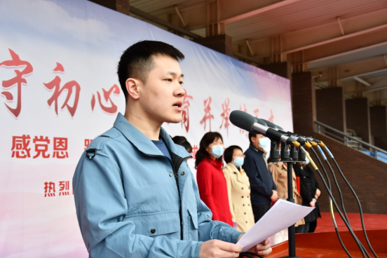 随后,由来自机械工程学院2018级的海宇涛同学代表全体学生发言,他向同学们讲述了天津海河河畔先进青年革命团体觉悟社的故事,在建党百年之际,他号召同学们要向革命先辈学习,接过历史的接力棒,以青春之我,担青春之责。随后他倡议全体同学:在面对依然不容松懈的新冠疫情防控局势时,要发挥当代青年的力量,立即行动起来,不做旁观者、不当局外人,积极接种新冠疫苗,共筑健康中国!