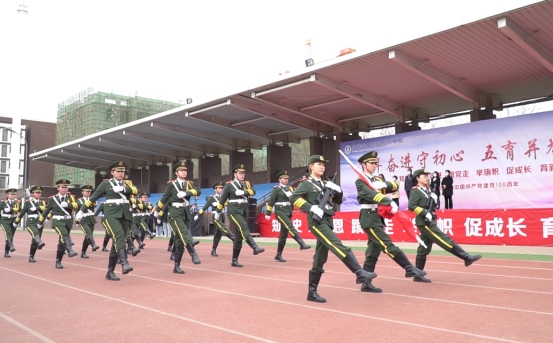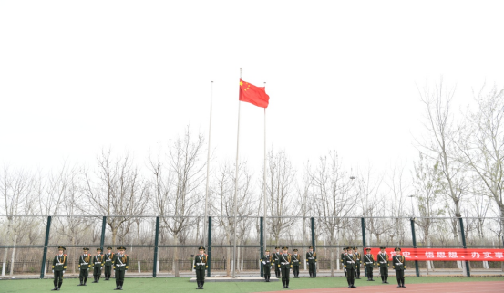 伴随着嘹亮的军乐声,学院国旗护卫队队员迈着整齐的步伐缓缓护送国旗进场,升旗仪式正式开始。伴随着国歌《义勇军进行曲》的响起,全体师生行注目礼,齐唱国歌,庄严肃穆。