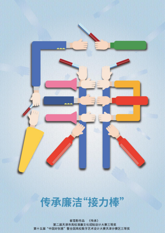 2021年10月,学院纪委和艺术工程学院从学院廉政文化大赛作品中遴选优秀作品,推荐参加第二届天津市高校清廉文化招贴设计大赛和第十五届“中国好创意”暨全国高校数字艺术设计大赛天津分赛区比赛。日前,两个大赛奖项评选工作接连落下帷幕。在第二届天津市高校清廉文化招贴设计大赛中,艺术工程学院杜美慧同学的作品荣获一等奖,潘悦霞同学的作品荣获二等奖,何丹丹、崔雪影同学的作品荣获三等奖,张迪、夏雨婷、贾泽琪等七名同学的作品荣获优秀奖。在第十五届“中国好创意”暨全国高校数字艺术设计大赛天津分赛区比赛中,韩娜、崔雪影两名同学的作品均荣获视觉传达组三等奖。后期,部分优秀作品奖将在“廉韵津沽”网站、“海河清风”微信公众号等平台推送展示。
