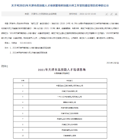为深入实施人才强市战略,加快高技能人才队伍建设,根据《天津市人民政府办公厅关于实施“海河工匠”建设的通知》和《市人社局关于遴选支持2021年天津市高技能人才培训基地和技能大师工作室建设有关问题的通知》文件要求,在天津市评选十家单位建设人才培训基地。