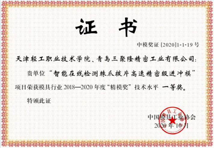 2018-2020年度“精模奖”技术水平一等奖获奖证书