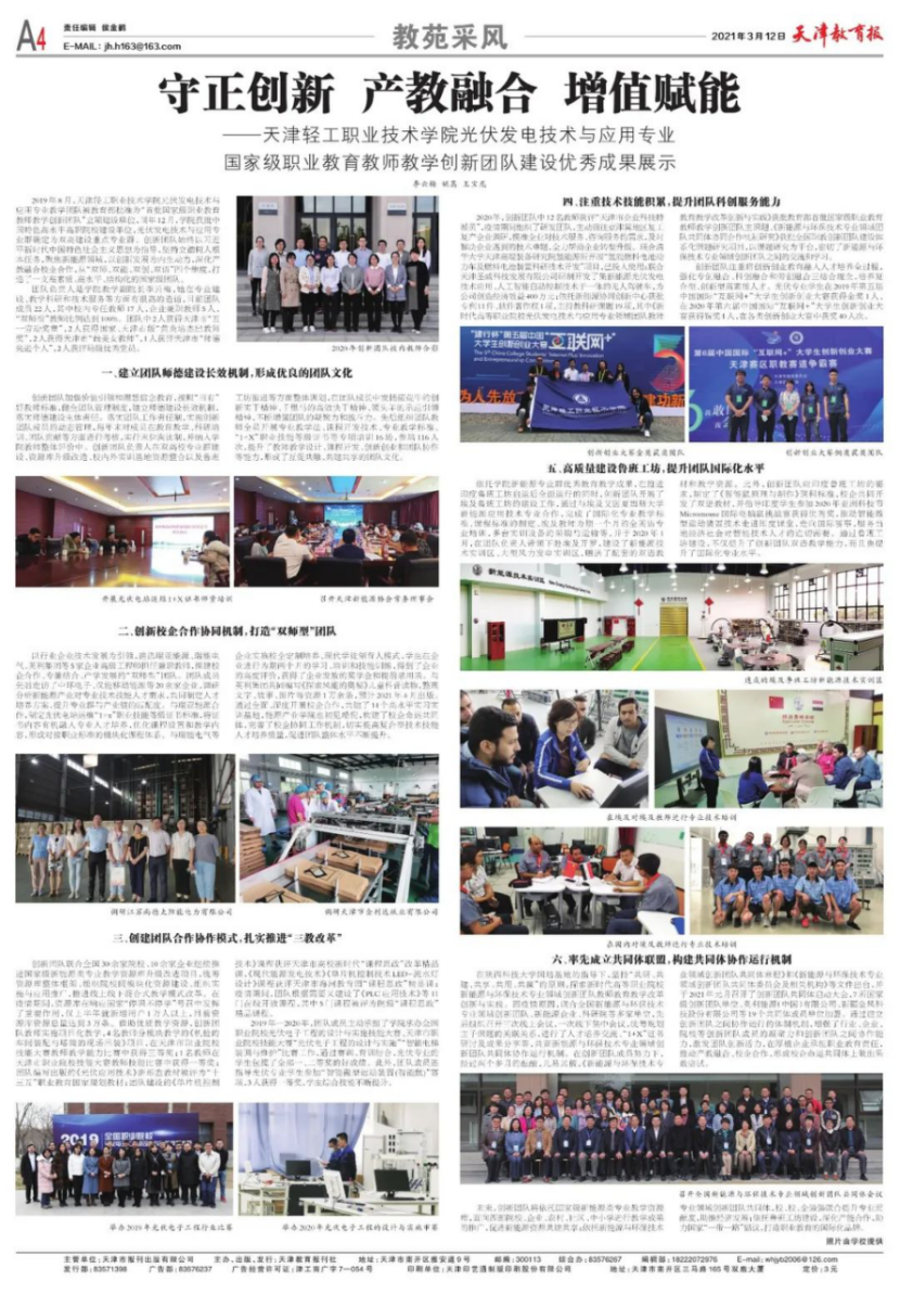 一是按照《教育部关于在教育系统开展师德专题教育的通知》(教师函〔2021〕3号)和天津市教委《关于转发教育部在教育系统开展师德专题教育的通知》(津教教师函〔2021〕5号)要求,面向广大教师组织开展师德专题教育,强化以党史学习教育为重点的“四史”学习教育,引导广大教师坚定理想信念、厚植爱国情怀、涵养高尚师德。二是成立人才工作领导小组,出台《新利18平台优秀人才引进与管理办法(试行)》,明确高层次专业群带头人的引进、认定及考核标准。三是制定《教师教学创新团队建设管理办法》,组建培育双师型结构化教师教学创新团队。通过体制创新,光伏发电技术与应用团队率先组建国内唯一的由1个培训基地+10个国家创新团队+12个高端企业组成的国家新能源与环保技术领域创新团队协作共同体,先后共同立项国家级课题两项。四是依托国家级技能大师工作室、企业实践工作站及科技特派员派驻,联合行业领军企业共同开展教师培训,打造一支“能说、会做、善研”的“双师型”专业教师队伍,教学及服务企业水平显著提升。五是制定以破“五唯”为导向的教师职称评聘标准,被《新时代高职院校评价体系研究》收录。