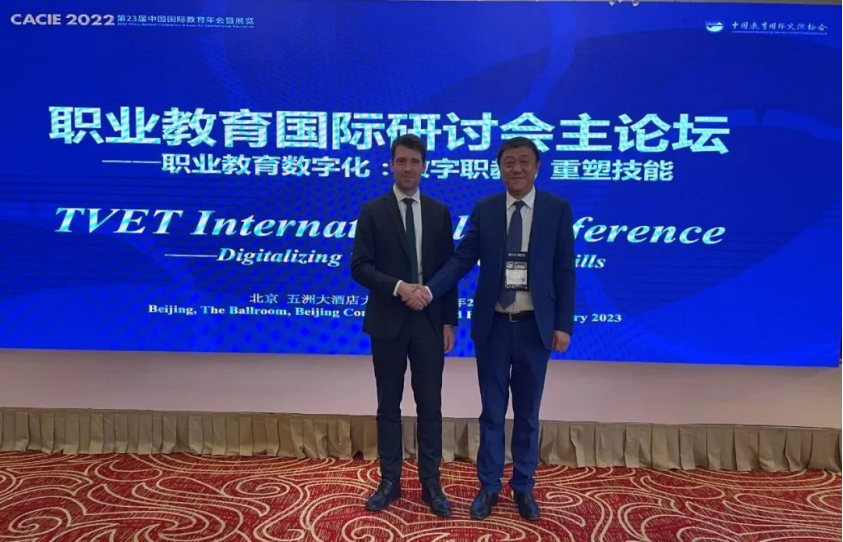 本届年会主题为“适应与改变——重塑我们的教育”,其中职业教育国际研讨会由中国教育国际交流协会职业教育与培训部主办,包括主论坛和职业教育跨境办学研讨会两部分。16日上午,召开题为《职业教育数字化:数字职教,重塑技能》主论坛,中外政府部门相关领导专家发表精彩发言,中国教育国际交流协会秘书长王永利致辞,中国教育部职业教育与成人教育司林宇副司长做题为《健全职业教育培养体系,推动现代职业教育高质量发展》的主旨报告,之后,中国驻德国使馆及瑞士驻华使馆领导做主旨发言,介绍了德国和瑞士职业教育及数字化发展经验。会议期间,党委书记戴裕崴专门与瑞士驻华使馆科技与教育处主任Philippe Roesle先生就中瑞职业教育合作和应用技术大学的建设路径进行深入交谈。戴裕崴书记向Philippe Roesle先生介绍了我院与瑞士GF的深度合作模式,包括校企共建的精密模具智能制造生产线、及共同组建的精密模具协同创新中心等情况,Philippe Roesle先生表示赞赏,并希望来津参观我院。戴裕崴书记还提出希望就建设应用技术大学与瑞士应用科技大学开展合作,及下半年举办中-瑞高端职业教育合作论坛,Philippe Roesle先生表示将大力支持中瑞职业教育合作,希望我院派代表到瑞士参观应用科技大学并开展深入合作,并表示下半年瑞士教育代表团将来华访问,届时将安排到我校参观访问,促进双方开展合作交流。