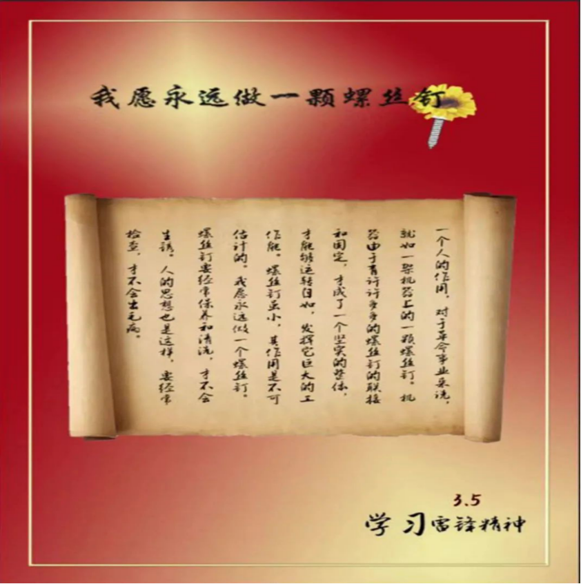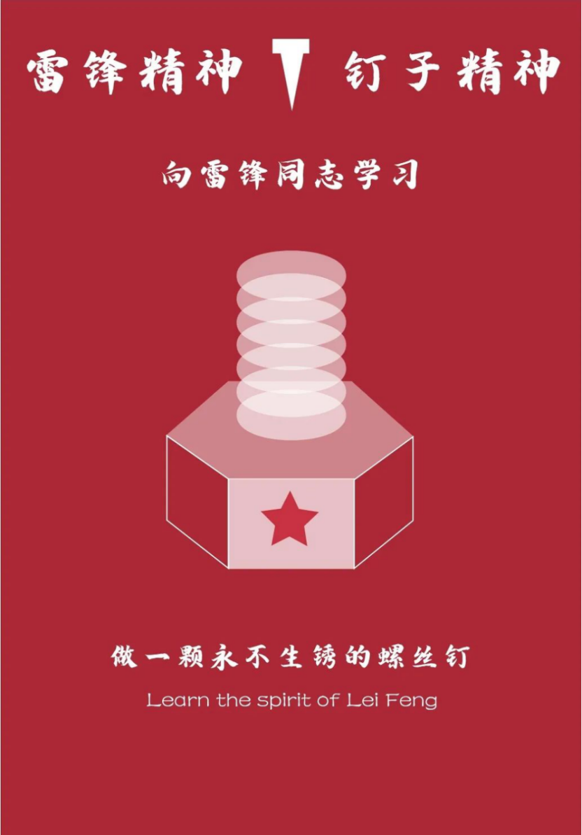 雷锋是我们心中“永不生锈的螺丝钉”。海报背景采用黄色和橙色,代表我们充满无限生机和活力,运用一颗颗钉子谱写歌唱祖国,意在表达我们每个人向雷锋同志学习,自觉融入党和人民的事业中去,干一行、爱一行、钻一行,立志在平凡中干出不平凡的业绩,定会使我们的祖国更加富强!