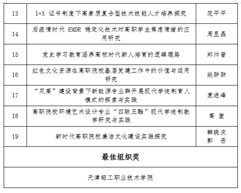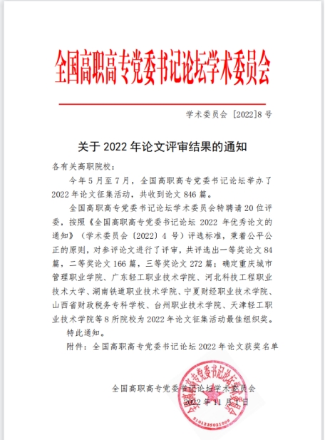 为全力推进学院教师科研水平再上新台阶,扩大学院教师科研成果的应用和推广范围,助力学院“双高”建设,学院于2022年5月组织学院教师参与全国高职高专党委书记论坛2022年论文征集活动。全国高职高专党委书记论坛2022年论文征集活动,在全国高职院校范围内共征集论文864篇,最终评选出获奖论文522篇,其中一等奖84篇、二等奖166篇、三等奖272篇。