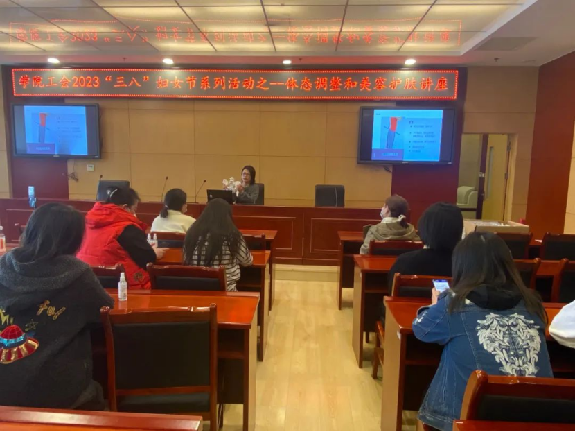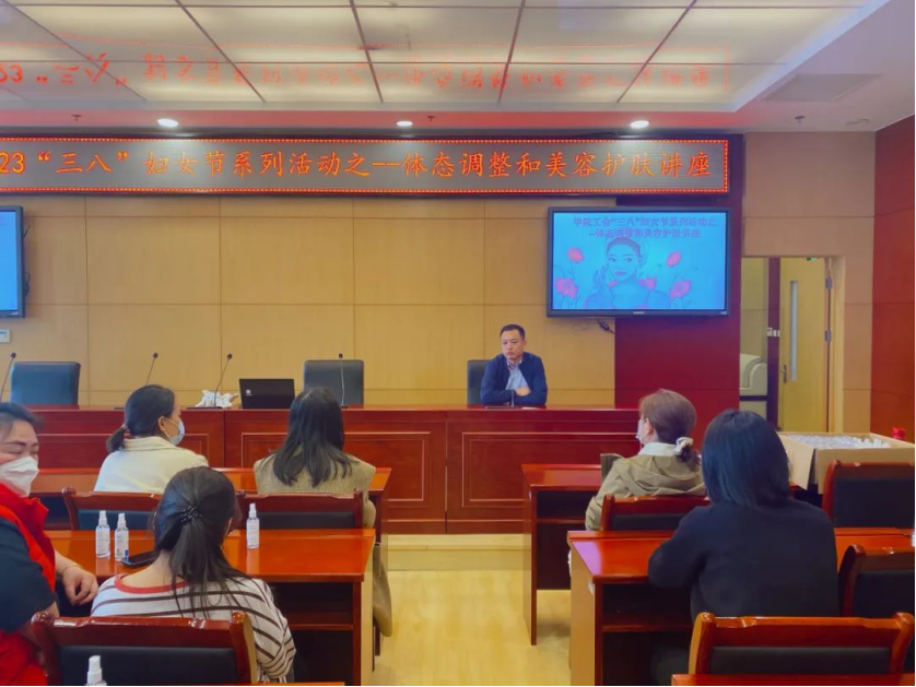 在讲座上,专业体态重塑老师带领大家通过原理讲解和动作带练纠正常见的不良体态,例如骨盆前倾、腰椎不适、肩颈疼痛等问题。美容护肤老师为大家讲解如何通过体质管理解决皮肤问题。通过讲座培养女职工的审美情趣和生活质量,提升个人的综合素质,满足女职工对美好生活的向往,得到了女教工的一致好评。
