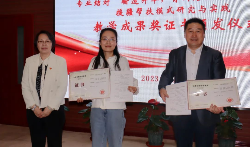 李云梅院长为和田职院教师韩沈平、我院挂职干部田洪军颁发天津市教学成果奖证书;和田职业技术学院副院长耿铁军为我院教师杨槟、张津辅等教师颁发兼职教师聘书,并希望两校教师联合教研,协作发展,共同推动三教改革。