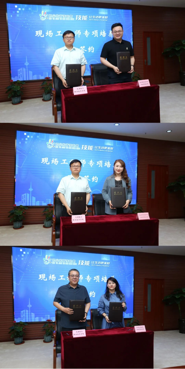 为进一步夯实校企合作基础,探索校企合作模式,会上,学院与上海三菱电梯有限公司签订校企战略合作暨准捐赠协议,与天津胜美科技有限公司、北京新大陆时代科技有限公司、上海三菱电梯有限公司签订校企合作董事会协议;与上海三菱电梯有限公司、浪潮软件股份有限公司、特变电工京津冀智能科技有限公司、山西华兴科软股份有限公司、北京新大陆时代科技有限公司签订共建产业学院协议,与北京新大陆时代科技有限公司、天津汽车模具股份有限公司、天津市鸿远电气股份有限公司签订现场工程师专项培养协议。