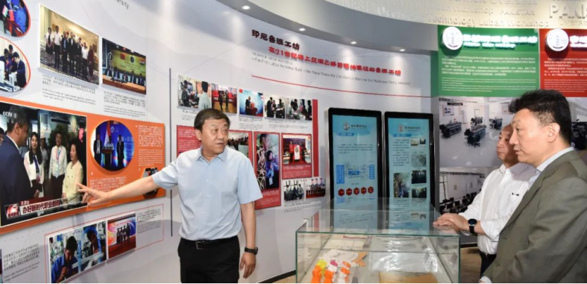 调研组一行首先实地考察了鲁班工坊建设·体验馆,听取了鲁班工坊的建设历程、标志性成果和以此为平台的中外人文交流情况介绍,并观看了鲁班工坊建设专题纪录片。