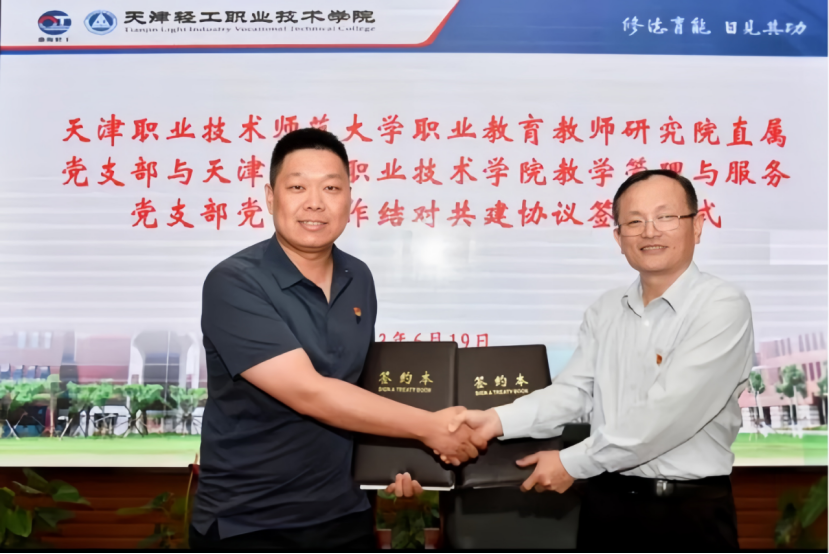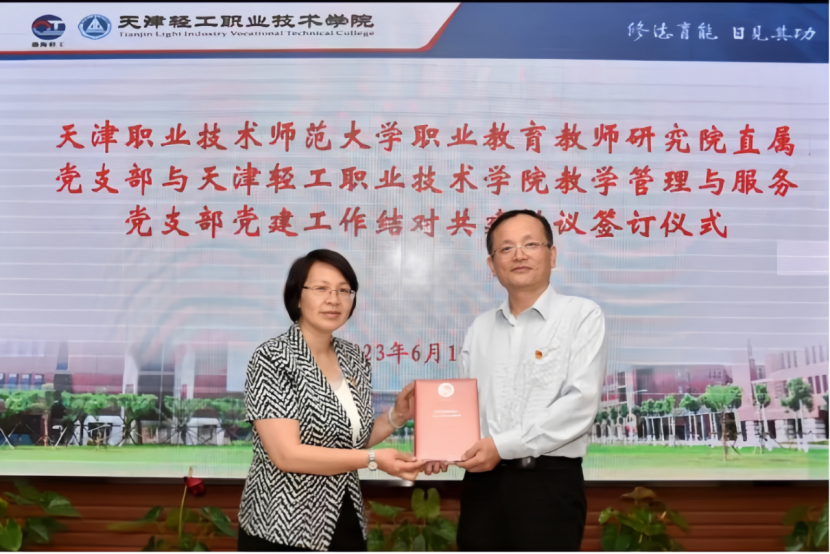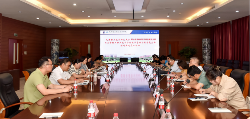 为深入学习贯彻习近平新时代中国特色社会主义思想,进一步加强校际合作,推进党建与业务双促双融,我院教学管理与服务党支部与天津职业技术师范大学职业教育教师研究院直属党支部于6月19日开展了结对共建党日活动。参加活动的人员有天津职业技术师范大学职业教育教师研究院直属党支部书记张元,正处级组织员王爱武,支部委员刘颖等一行13人;我院党委副书记、院长李云梅,党委委员、副院长刘悦凌,教务部部长王宝龙,科研部副部长王春媚,校企合作与培训部实岗锻炼干部王安,教学管理与服务党支部副书记张梦龙及支部相关人员进行了座谈交流。