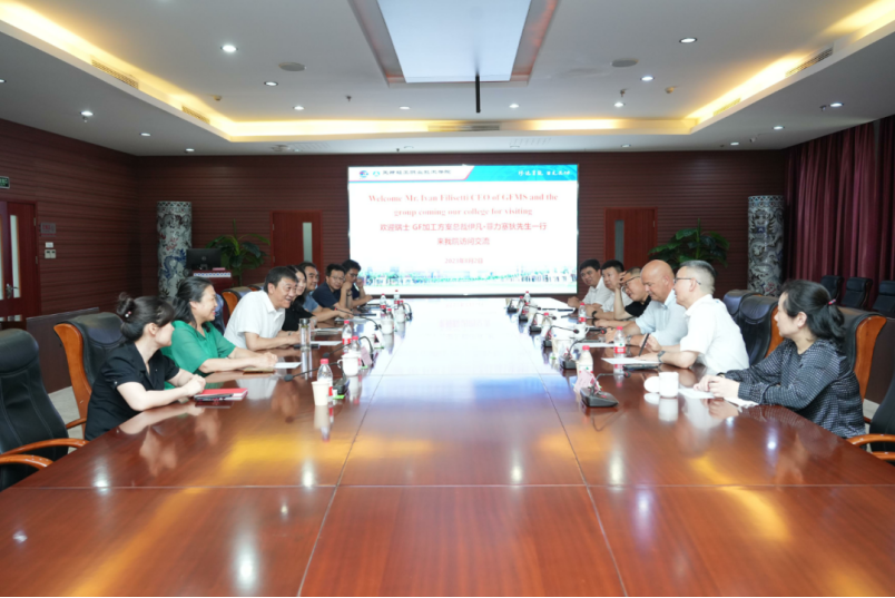 2023年8月2日下午,瑞士GF加工方案全球总裁Ivan Filisetti先生、中国区总裁陈以祥先生一行5人来我院进行参观和交流访问,同行的还有天津康圣特电子有限公司董事长邢建国先生。学院党委书记戴裕崴及国际交流与合作部、校企合作与培训部、机械工程学院和电子信息与自动化学院负责人参加了接待,天津市模具工业协会秘书长王振云参加了座谈会。