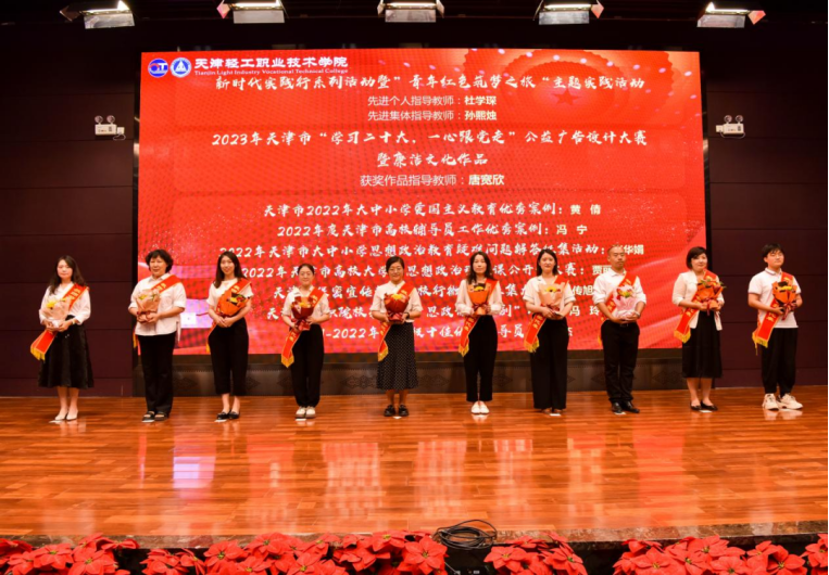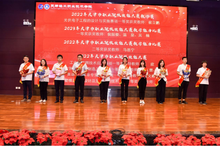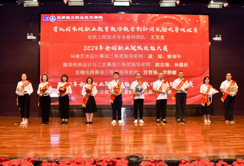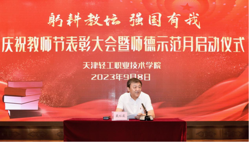 最后,党委书记戴裕崴讲话,对大家一年来辛勤工作表达了敬意和充分肯定,对受表彰教师和集体表示衷心祝贺。戴书记与全体教职工一起回顾了学院发展的历史阶段,分别是学院2001年成立并奋斗创业的“启航“阶段;2011年迁入海河教育园新校区并启动百所示范性骨干高职院校建设的“跨越”阶段;以及2019年进入全国前56所“双高校“建设行列的“深耕”阶段,2024年学院面临全国新一轮“双高校”遴选和职教本科冲刺筹建的新阶段,戴书记以详实的数据客观分析了学院下一步发展的优势以及需要解决的瓶颈问题,为学院未来发展与大家交心交底,他希望全体教职工始终保持昂扬向上的姿态,要牢固树立“躬耕教坛,强国有我”的精神,争做“四有”好老师和“四个引路人”,努力培养更多德智体美劳全面发展的社会主义建设者和接班人。