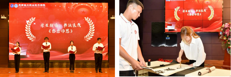 学生代表为老师们朗诵及书法表演《感念师恩》,表达对老师们的节日祝福。