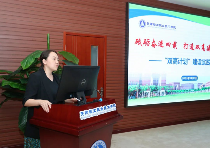 质量管理中心副主任霍琳作题为《砥砺奋进四载 打造双高建设轻工样板——“双高计划”建设实践及成果分享》的专题报告,分别从双高建设总体情况、建设任务落实情况及建设成效与特色亮点三方面内容来分享。