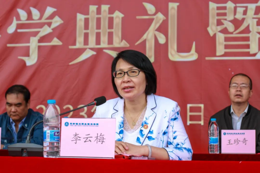 最后,学院党委副书记、院长李云梅作动员讲话并宣布开训。李云梅院长代表全体教职员工向2023级新生的到来表示真诚的祝贺和热烈的欢迎,并向同学们介绍了学校的发展历程、现有的发展成就和未来的发展规划,鼓励同学们投入到学校4.0版本蓝图的建设中。同学们将在这里领悟“修德育能 日见其功”的校训;将在这里厚植文化底蕴、精湛一技之长、锻造工匠精神;将在这里把自己打造成为“心中有爱、肩上有责、肚里有货、手中有艺、身上有光”的时代新人。在新生们开启大学生活之际,李云梅院长向新生们提出四点期望: