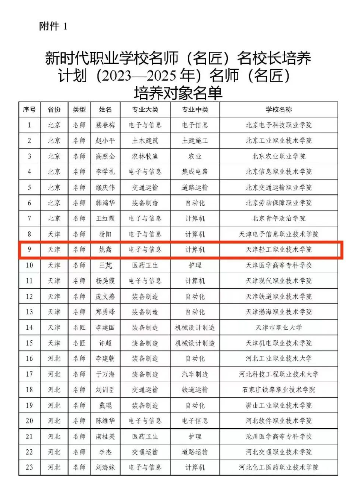 近日,教育部下发了《关于公布新时代职业学校名师(名匠)名校长培养计划(2023-2025年)培养对象和培养基地名单的通知》(教师厅函〔2023〕23号),我院电子信息与自动化学院院长姚嵩教授入选名师(名匠)培养对象名单。