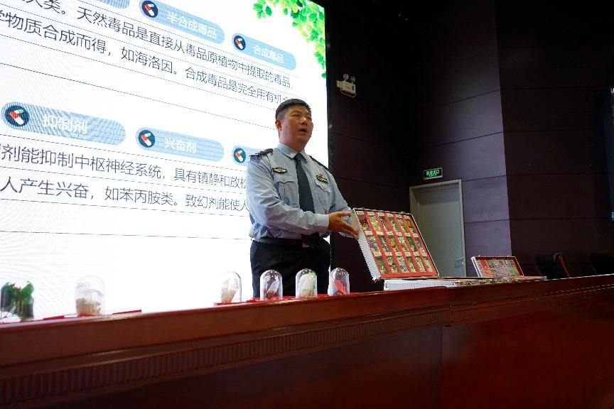 港南戒毒所南开大队石磊副大队长通过生动的案例,向学生们讲解毒品的定义、种类、特征等知识,剖析了毒电子烟、毒邮票、毒饮料等新型毒品的危害,引导学生抵制诱惑,远离毒品,树立正确的人生观。讲课结束后,同学们近距离观察了仿真毒品模型,牢记民警传授的辨别毒品的方法,提高对毒品的辨识能力。