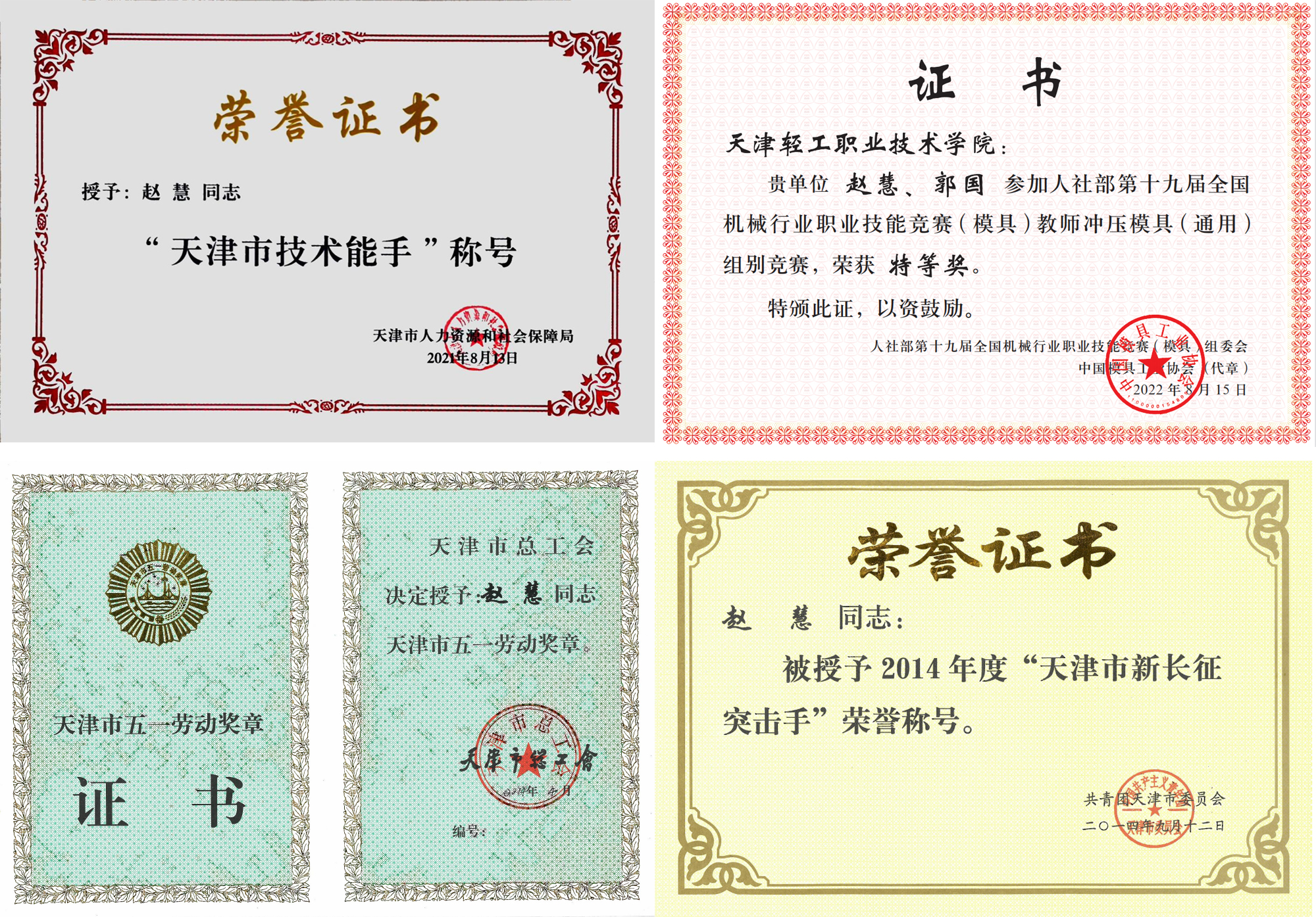 赵慧,机械工程学院教师,曾获得天津市五一劳动奖章、天津市技术能手、天津市新长征突击手等荣誉称号。长期从事先进制造加工及相关教学工作;曾作为短期技术专家,赴埃塞俄比亚、埃及进行技术援助指导;多次参加、指导学生参加省市级、国家级技能大赛并屡次获奖。发表专业论文10余篇,主编双语教材3部,参编教材1部,主持完成研究课题2项,横向课题2项,参与课题10项。第十九届全国机械行业职业技能竞赛冲压模具教师组特等奖,被人社部授予“全国技术能手”称号。