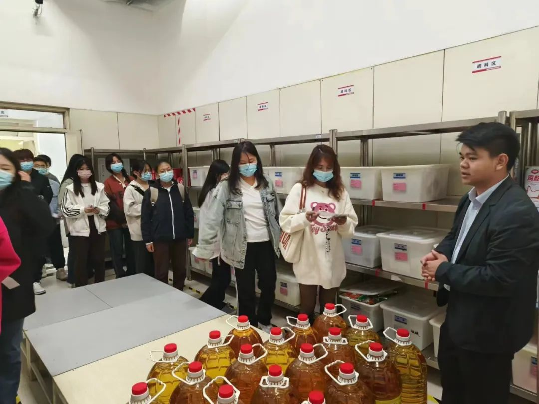 学生代表依次参观了一食堂、二食堂、三食堂及清真食堂后厨,各食堂负责人为学生代表讲解各食堂功能区设置、工作机制、洗消流程、采购渠道、入库质检、原材料储存方式等流程,让学生充分了解学院食堂菜品从原材料采购到最后呈上餐桌的每一环节的工作及保障。