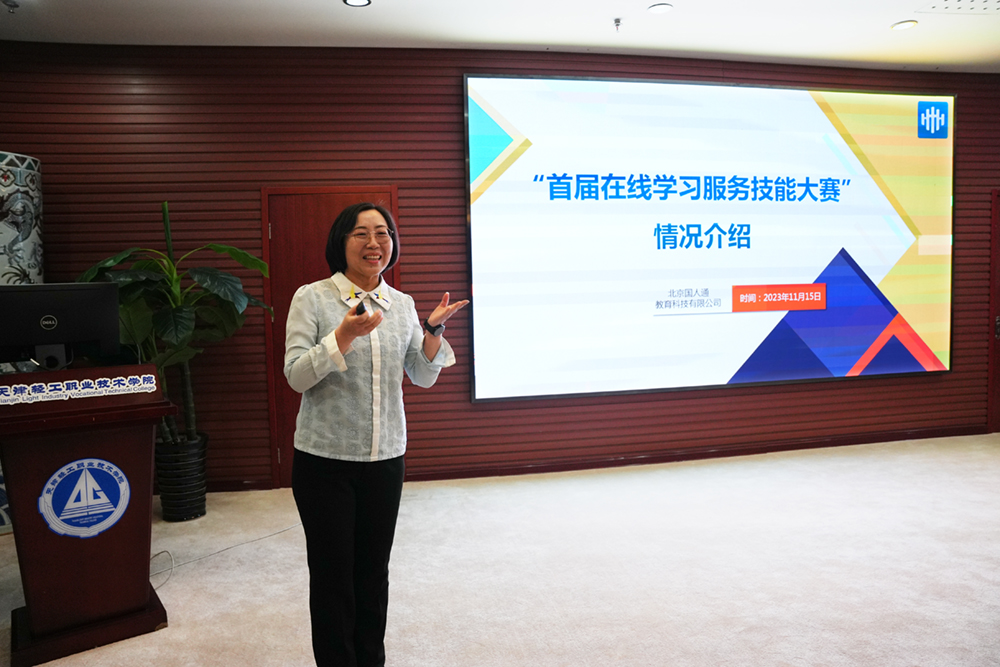 北京国人通公司职教事业部教研员高银虎介绍公司基本情况并围绕在线教育起源与发展、在线学习服务培训课程、证书运作流程、在线学习服务师就业前景四个方面展开了详细介绍。北京国人通公司教务部线上教务组主管倪伟介绍了首届在线学习服务技能大赛的基本情况,包括活动组织、活动内容与方式、活动要求、活动流程及时间安排、奖项设置。