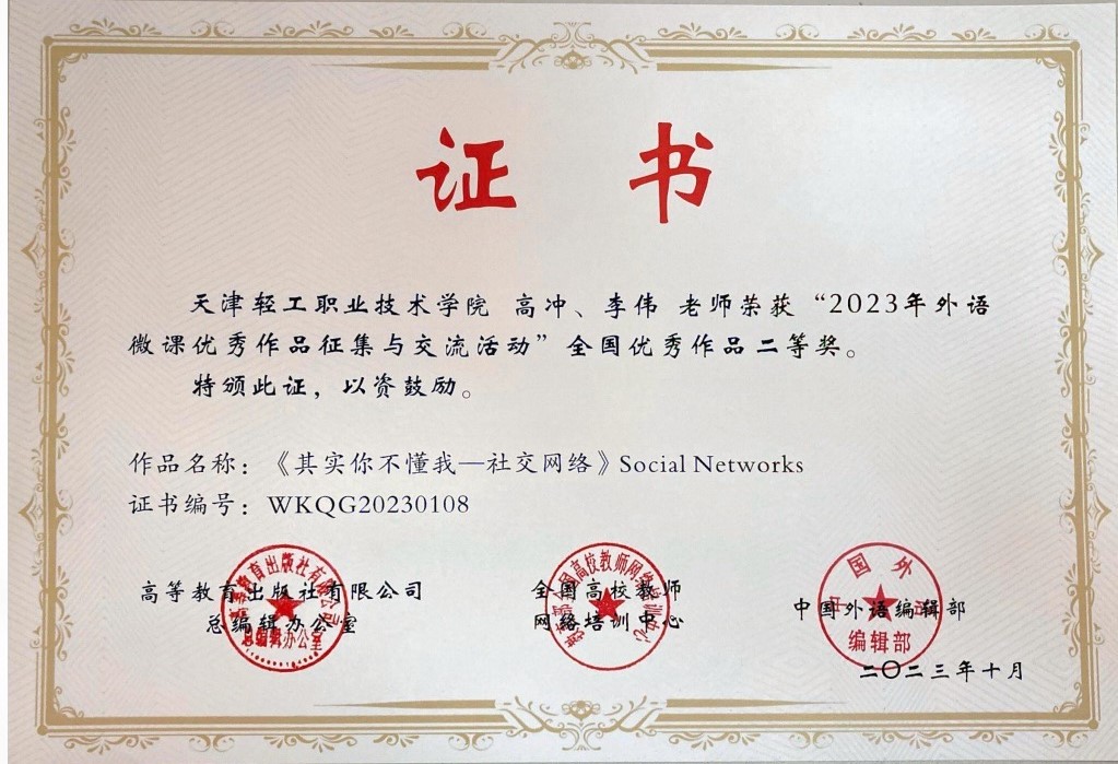 该作品代表学院参加天津市复赛,荣获天津市一等奖并推荐参加全国交流决赛。备赛期间,在学院领导和同事们的支持下,参赛团队认真准备教学设计和微课视频材料,反复打磨说课内容,最终荣获二等奖,此次获奖充分展现了我院教师的教学风采,以优异成绩助力学院“双高”建设。