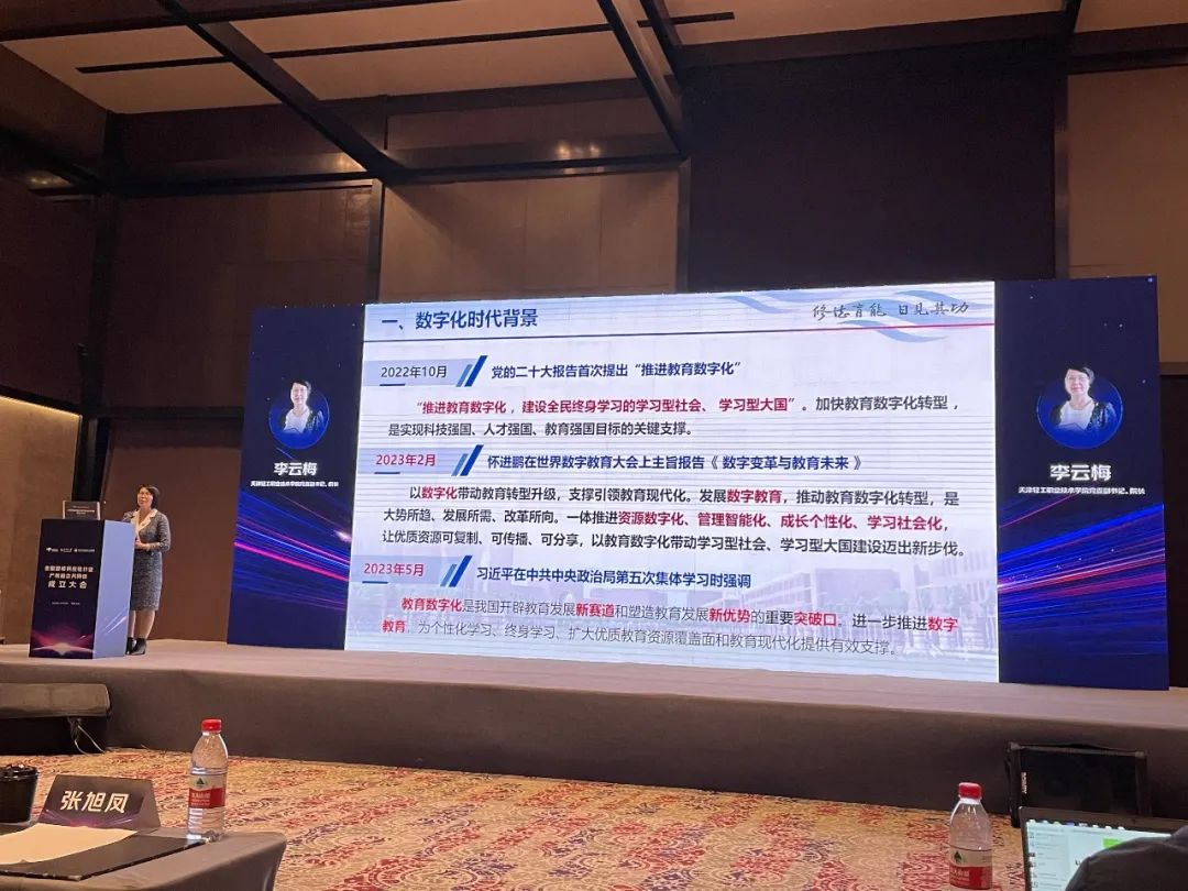我院院长李云梅在成立大会上作了题为《数字化赋能职业院校高质量发展的探索与实践》的专题报告,报告中结合国务院印发的《数字经济“十四五”发展规划》以及教育部《关于进一步推进职业院校数字校园建设试点的通知》等新文件新要求分享了数字化时代背景,数字化赋能教育,数字化场景应用三部分内容。大家共同碰撞新理念、启发新思路,受到与会单位同仁的广泛关注。    李云梅院长讲授报告
