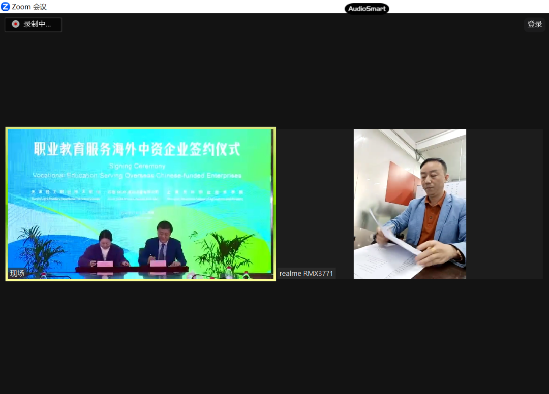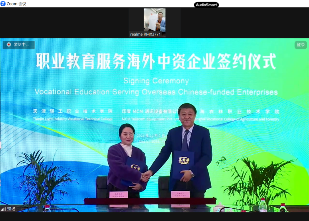 最后,两校与印度MCM通讯设备有限公司采用线上线下相结合的形式共同举办“职业教育服务海外中资企业”签约仪式,印度MCM通讯设备有限公司总经理李格及企业印度员工代表于线上参加了仪式。仪式上,三方共同签署了《中文+职业技能培训项目合作协议》。
