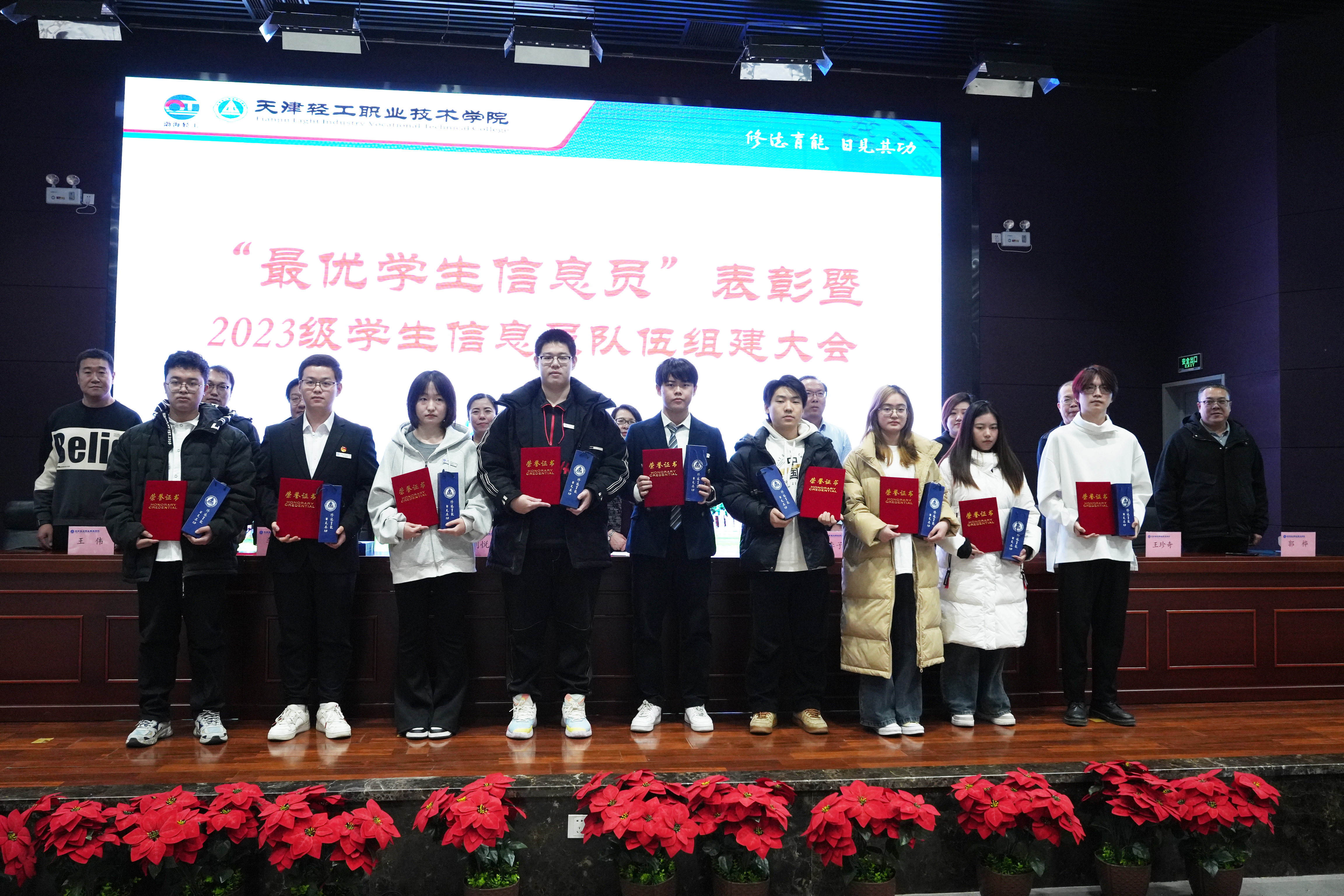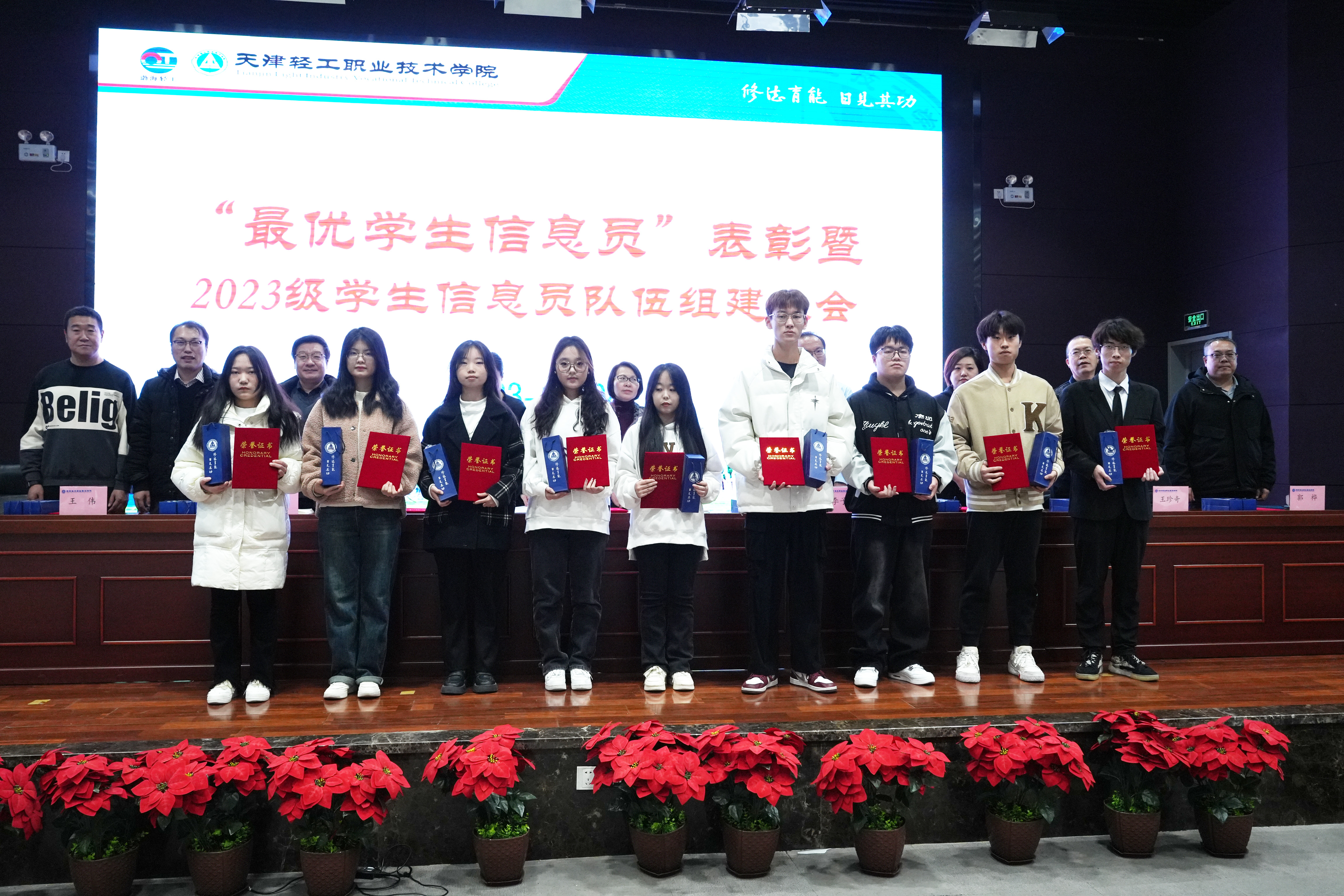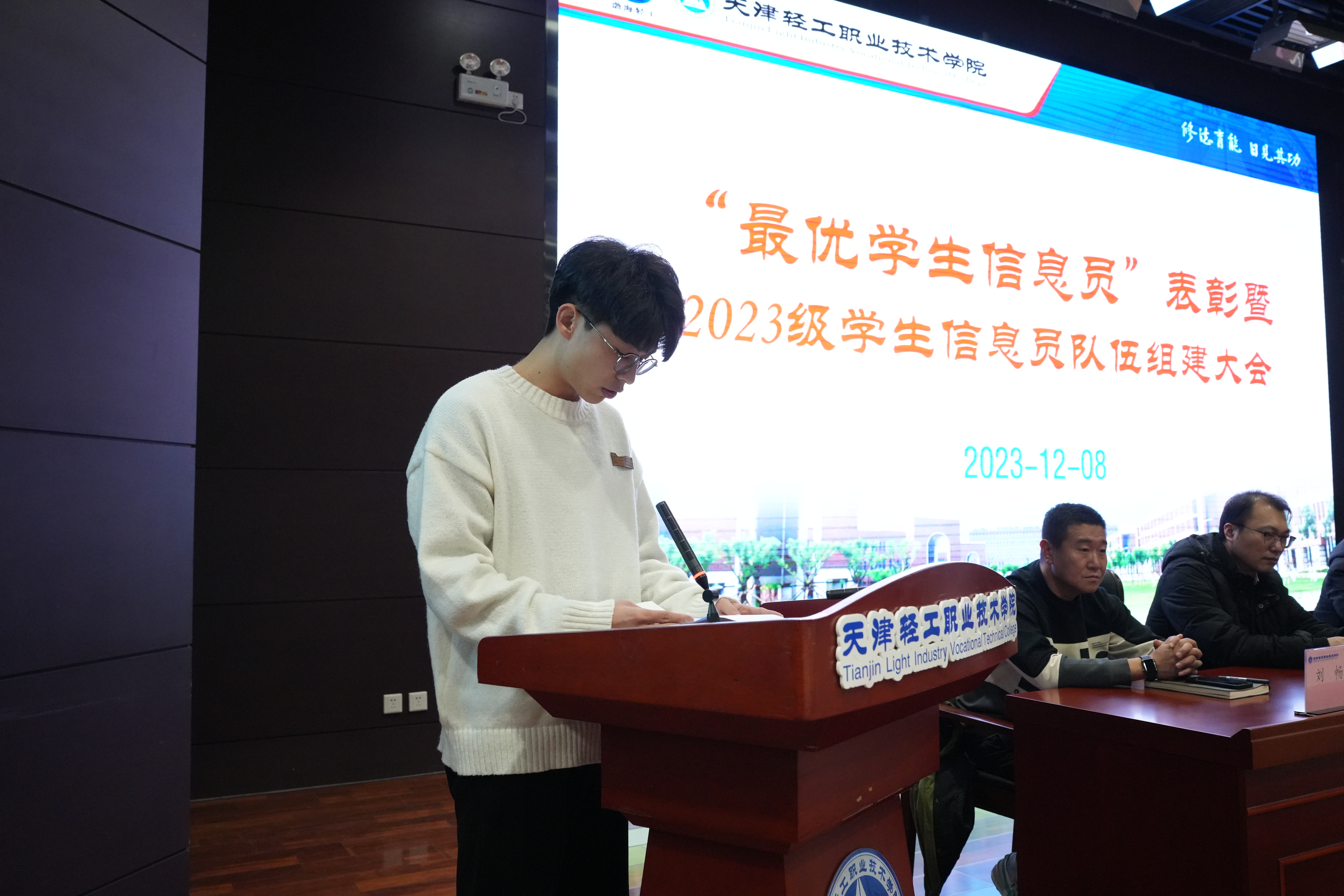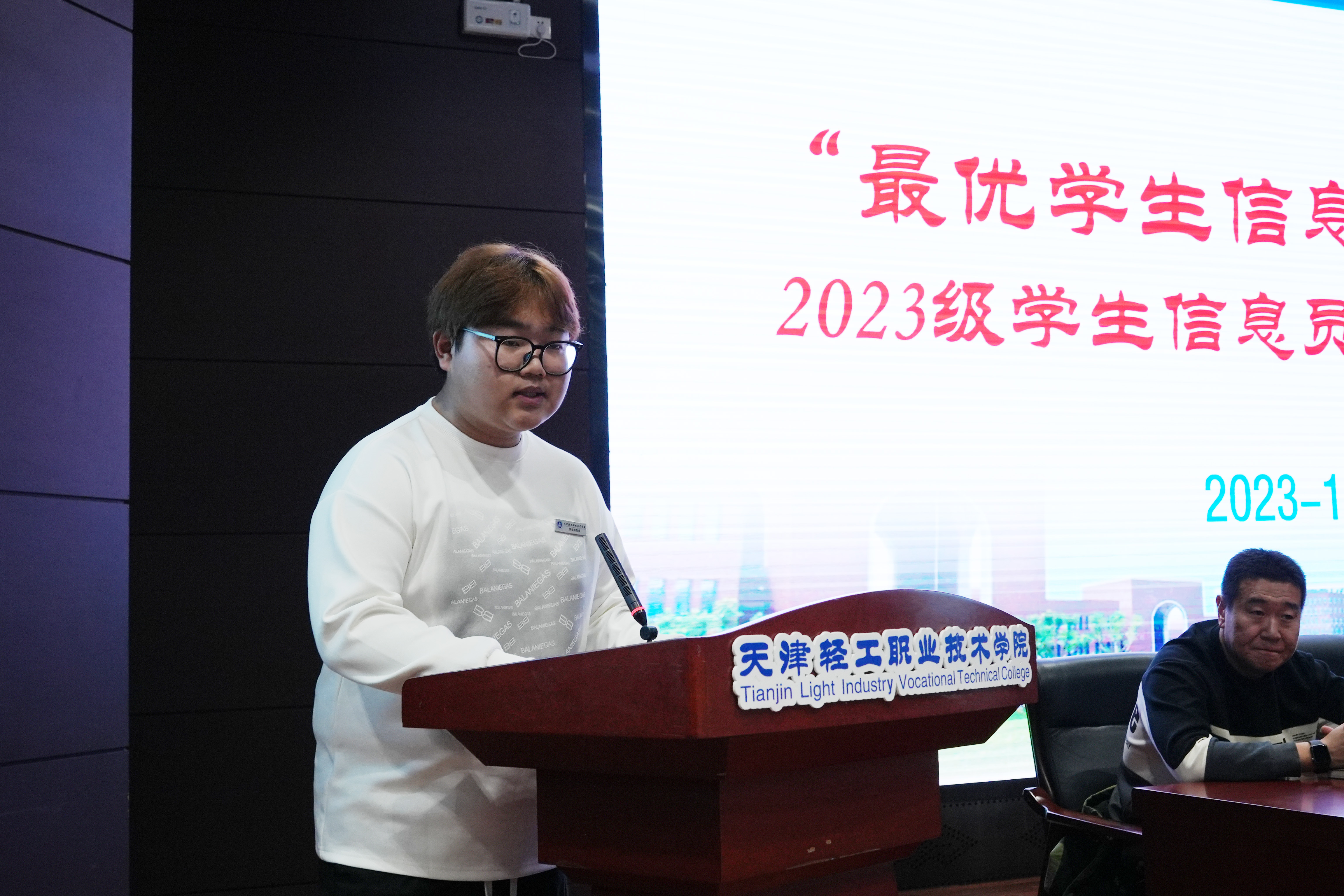 第一阶段:举行“最优学生信息员”表彰仪式   本学年,四个二级学院共评选出41名“最优学生信息员”,受表彰的同学依次走上主席台接受表彰。“最优学生信息员”代表艺术工程学院2022级环境艺术设计302班卢文剑上台发言,对一年多的信息员工作进行总结,展现出荣誉感和使命担当,号召同学们为建设更加美好的轻工校园贡献力量。