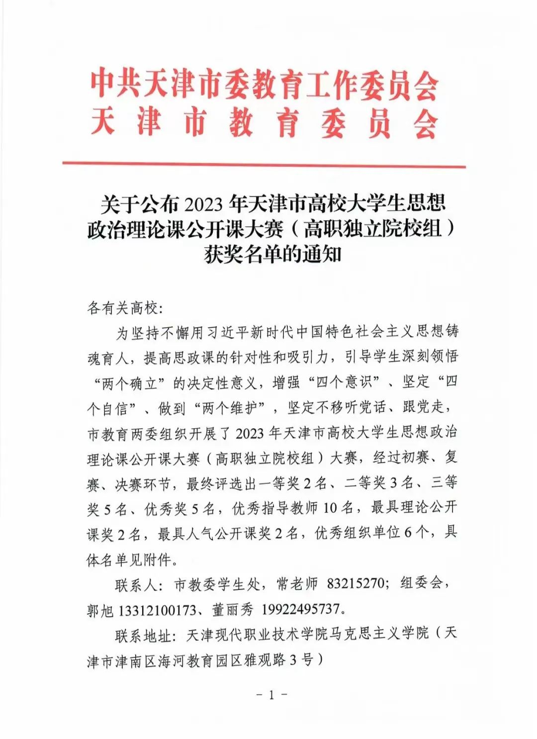 为坚持不懈用习近平新时代中国特色社会主义思想铸魂育人,提高思政课的针对性和吸引力,引导学生深刻领悟“两个确立”的决定性意义,增强“四个意识”、坚定“四个自信”、做到“两个维护”,坚定不移听党话、跟党走,市教育两委组织开展了以“新思想引领新征程·新青年建功新时代”为主题的2023年天津市高校大学生思想政治理论公开课大赛。经过初赛、复赛、决赛三个环节,我院学生石宇博、张珺、朱金龙的参赛作品《纸短情长 山河无恙——让抗美援朝精神在新时代熠熠生辉》脱颖而出,荣获高职独立院校组一等奖,指导教师吴楠、彭少勇、温泉获得“优秀指导教师”荣誉称号。