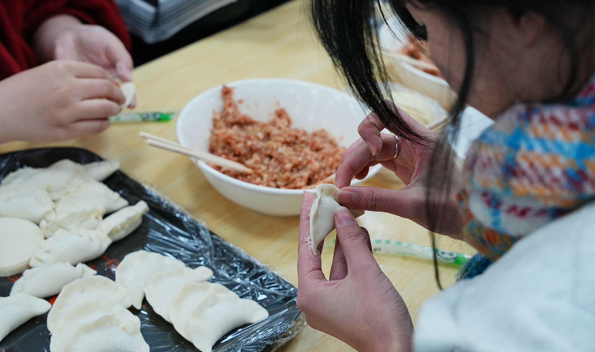 终场哨响起,大家打趣地相互观摩周围同学包的饺子,比较形状,探讨手法,说着各地习俗,分享生活趣事,现场欢声不断,笑语迭起。