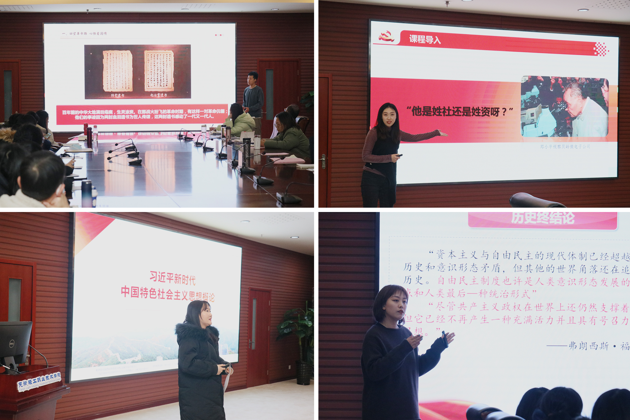 为深入贯彻落实习近平总书记重要讲话精神,重温学习习近平总书记关于思政课建设的重要指示和要求,落实天津市教育两委关于思政课教师磨课大练兵和“拿手一课”的要求,纵深推进思政课的改革创新,12月22日,我院马克思主义学院在第一会议室举办了一场别开生面的“磨课练兵”。此次磨课练兵活动由马克思主义学院教师侯辰俊、李婷、吕传旭、王一珂主讲,马克思主义学院全体教师参加。