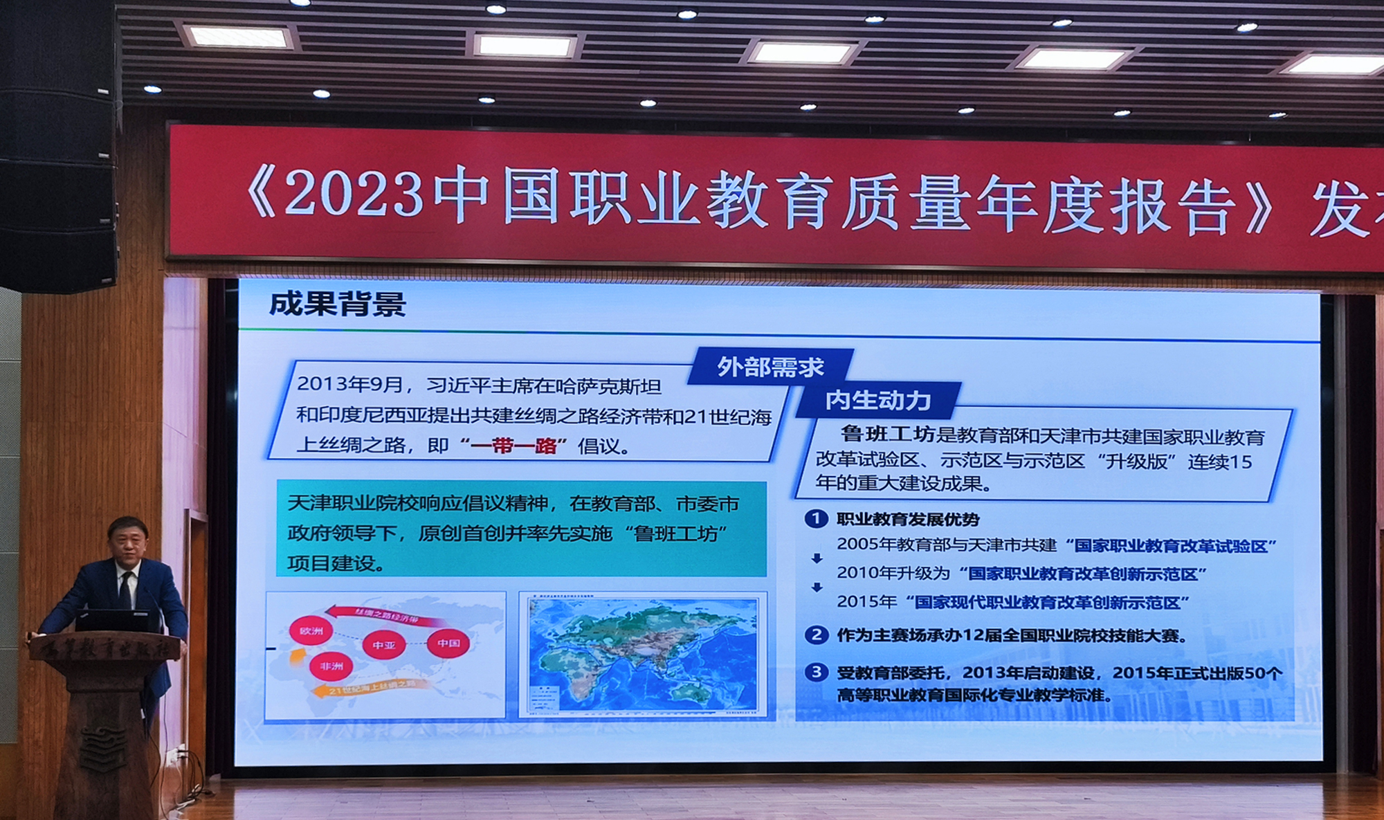 近日,《2023中国职业教育质量年度报告》发布会在北京举行。由中国教育科学研究院、全国高等职业院校校长联席会议编制的《2023中国职业教育质量年度报告》由高等教育出版社出版并正式发布。   学院党委书记戴裕崴受邀参加本次发布会,并作题为《教随产出 校企同行》的案例分享,主要介绍学院近年来在鲁班工坊服务国家“一带一路”建设,以及为合作国培养适应本土经济发展的技术技能人才等方面所发挥的重要作用。