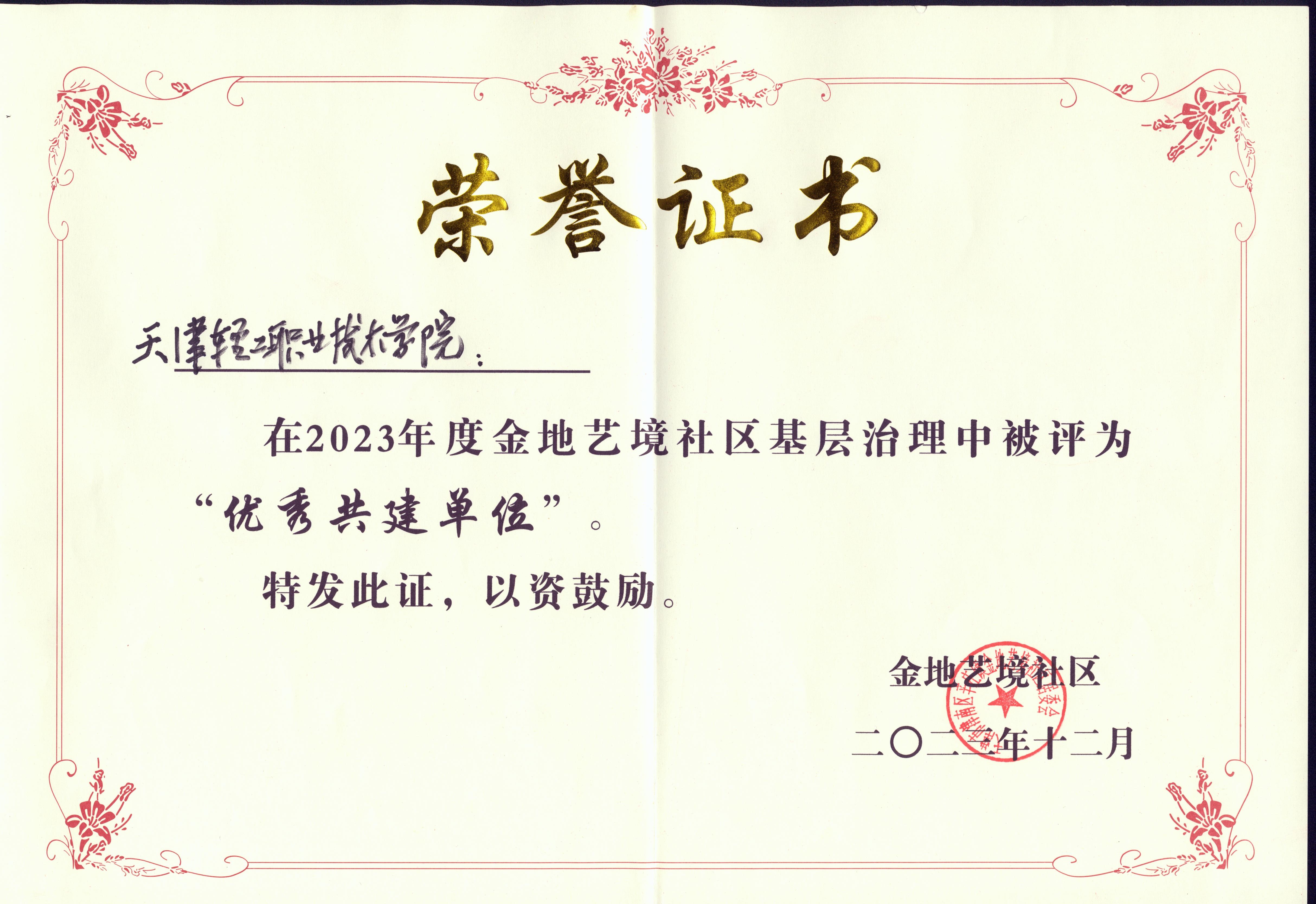 近日,津南区辛庄镇金地艺境社区举行了“庆元旦 迎新春”文艺汇演暨“共话收获 共开新篇”金地艺境2023年度党建共建工作总结大会,我院选派的书法秀、吉他弹唱获得赞誉,大会上学院获得开展的2023年金地艺境社区基层治理“优秀共建单位”称号。