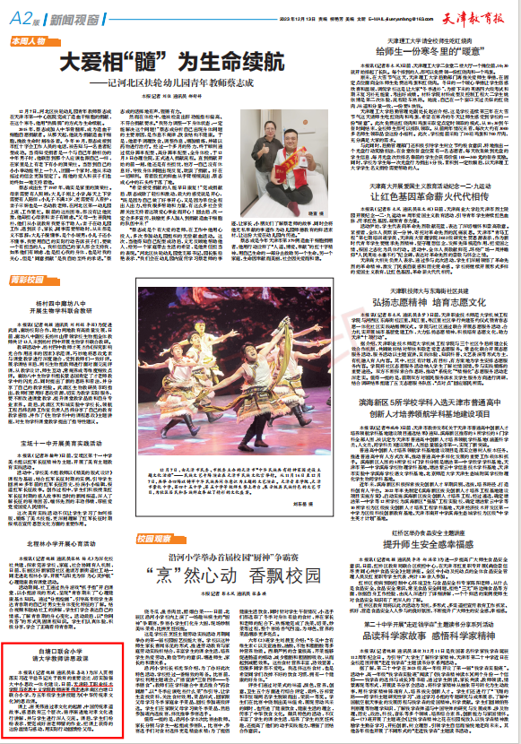 唐英伟老师围绕“中华优秀传统文化——孝道”主题,从“什么是孝”“为什么尽孝”“怎样尽孝”三个层次讲述中华传统孝道文化的历史渊源与当代价值,引导同学们作为新时代的学生应懂得尊重父母、敬爱父母、感恩父母,从而内化为发奋努力、立志成才的动力,以进取向上的人生来回报父母,实现自己的人生理想。唐英伟老师走进白塘口联合小学讲授思政课的事迹,被天津教育报报道。