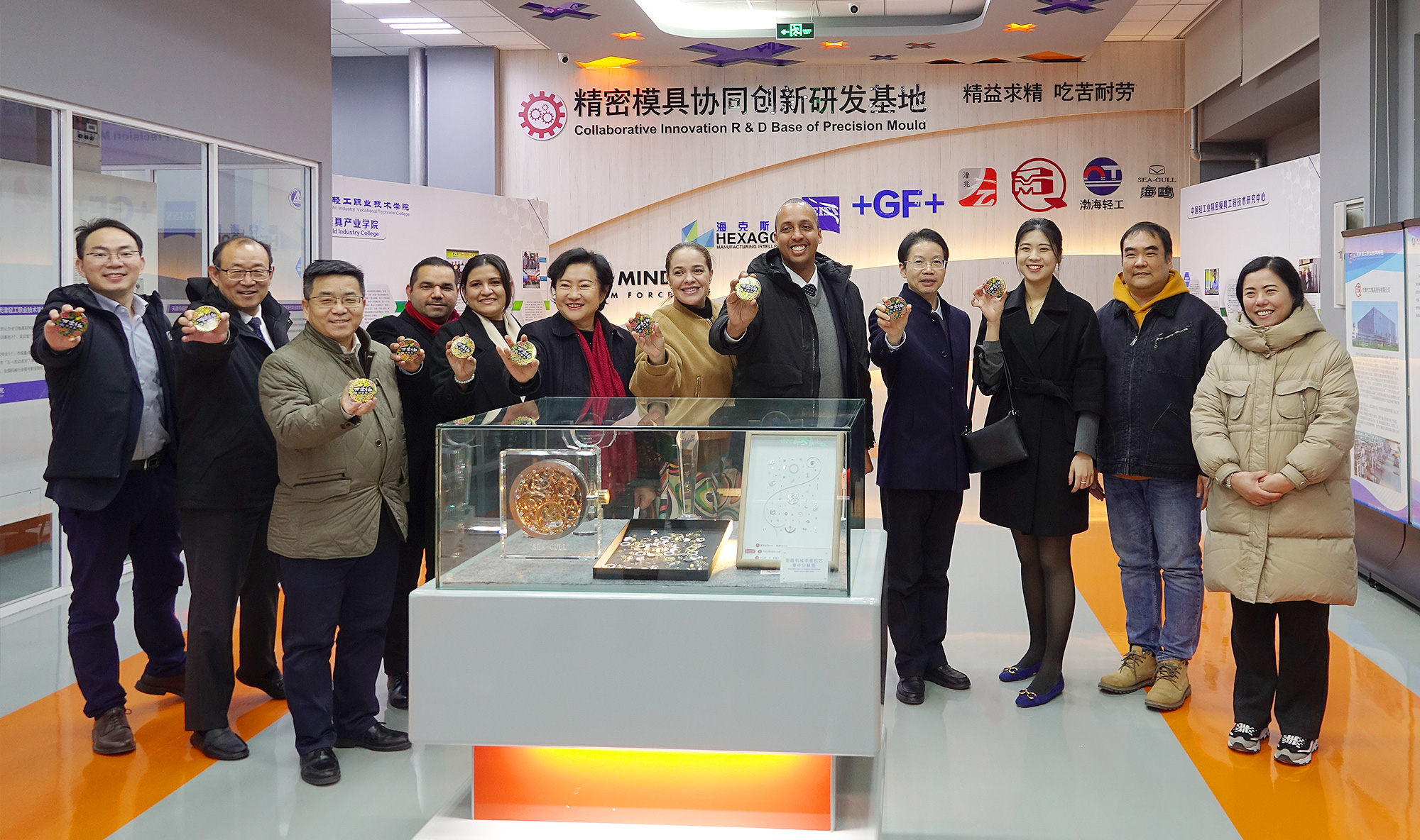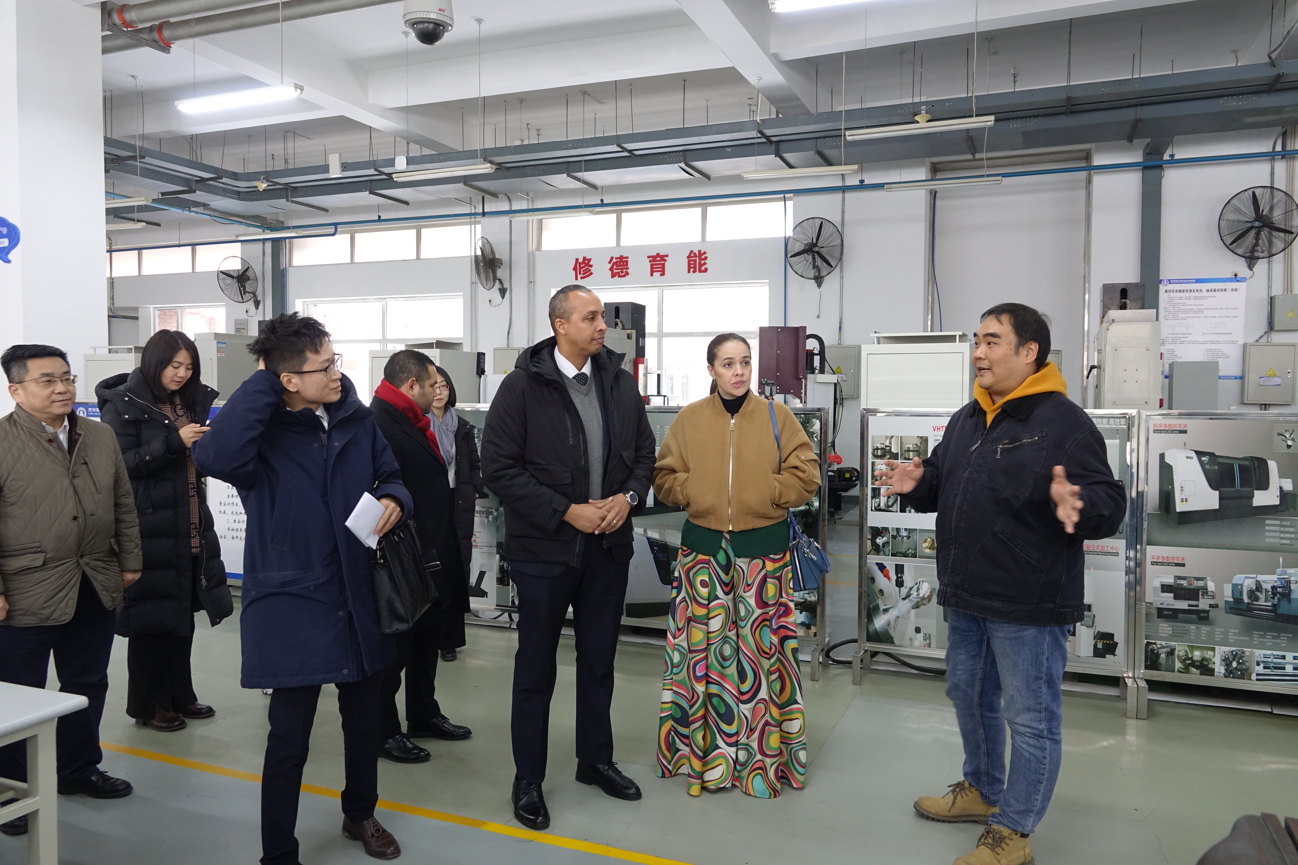 随后,大使一行参观了机械工程学院精密模具协同创新中心,机械工程学院院长王宝龙详细介绍了我院模具设计与制造专业的建设发展情况及我院与瑞士GF加工方案集团、德国卡尔蔡司、天津海鸥表业集团有限公司等知名企业开展校企合作的实际情况,以及在技术攻关、成果转化等方面的最新成效。王宝龙院长还向大使展示了乌干达技能培训项目机械加工专业教师在机械工程学院经过3个月培训后制作的机械模具。