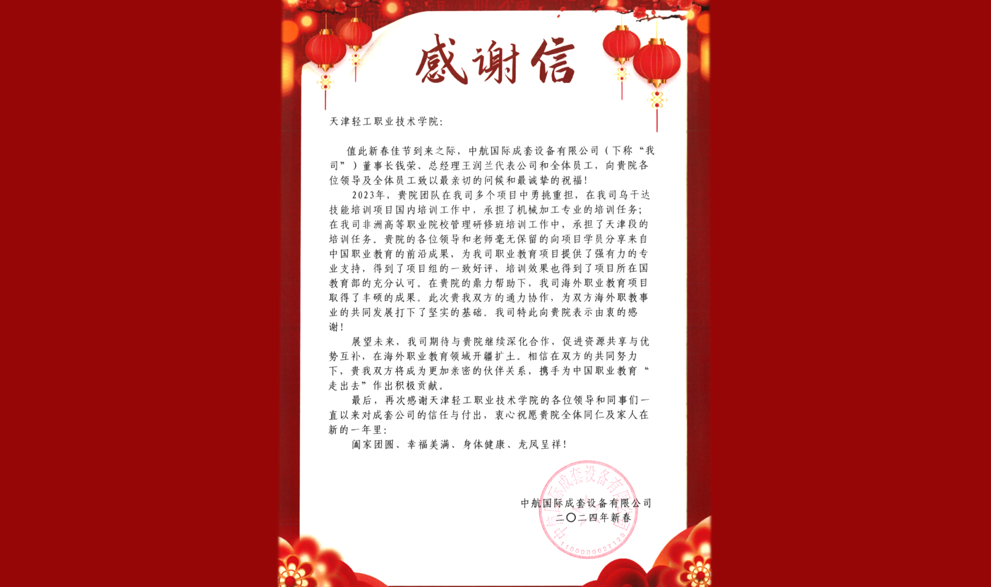 近日,中航国际成套设备有限公司向学院发来感谢信,对学院在2023年10月11日至2024年1月10日期间承办的乌干达技能培训项目提供的专业培训及服务支持给予充分肯定和诚挚感谢。