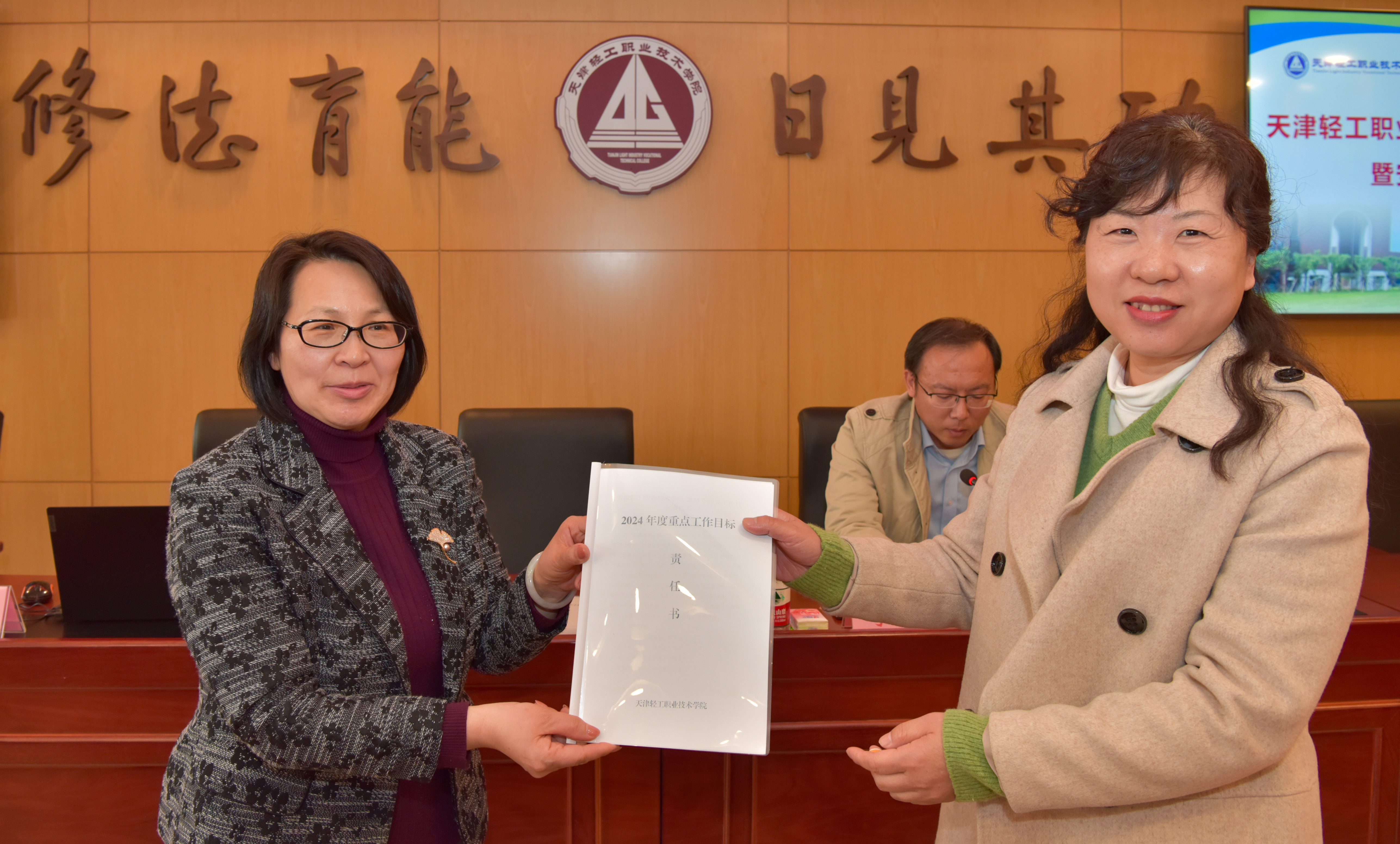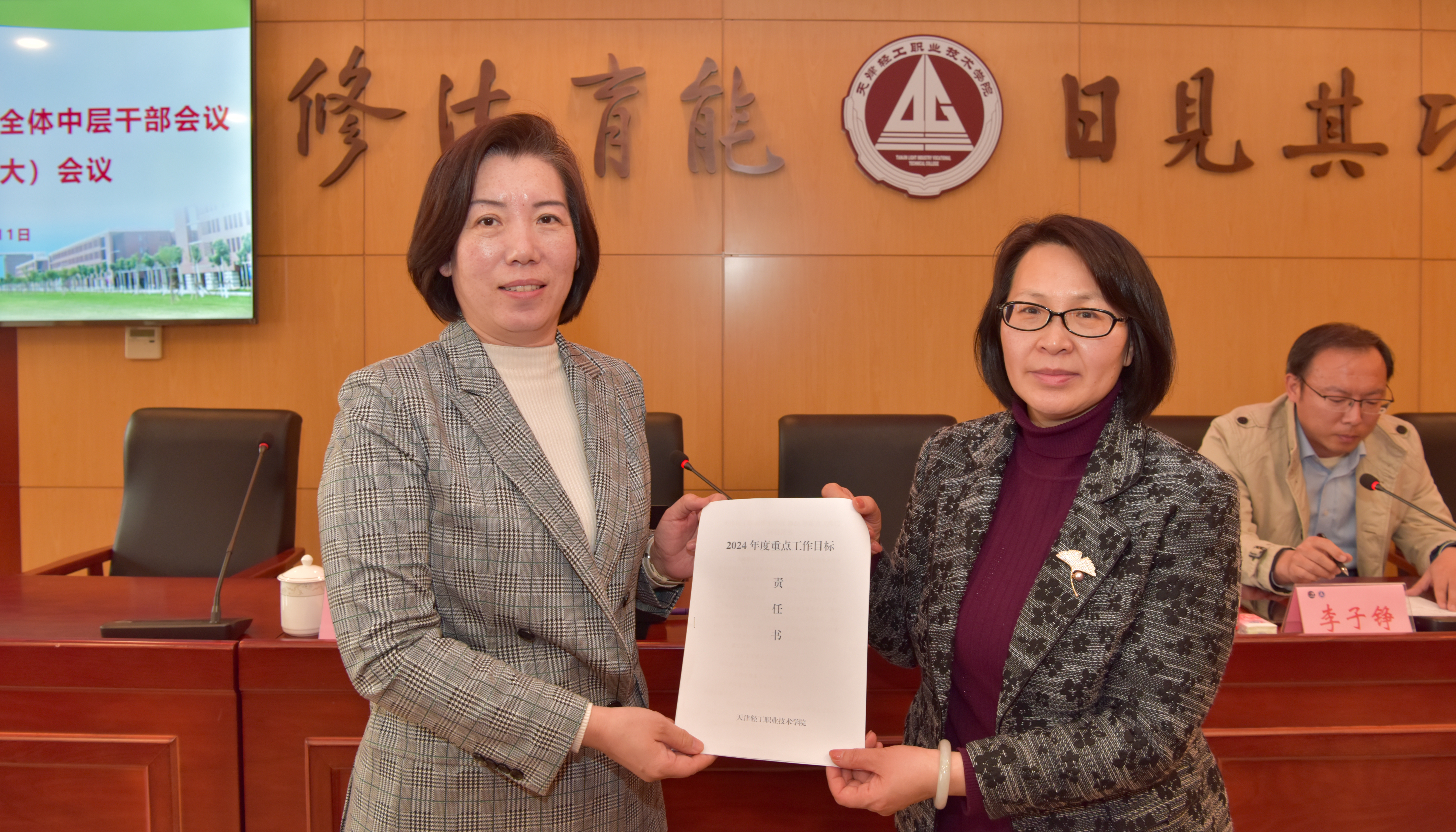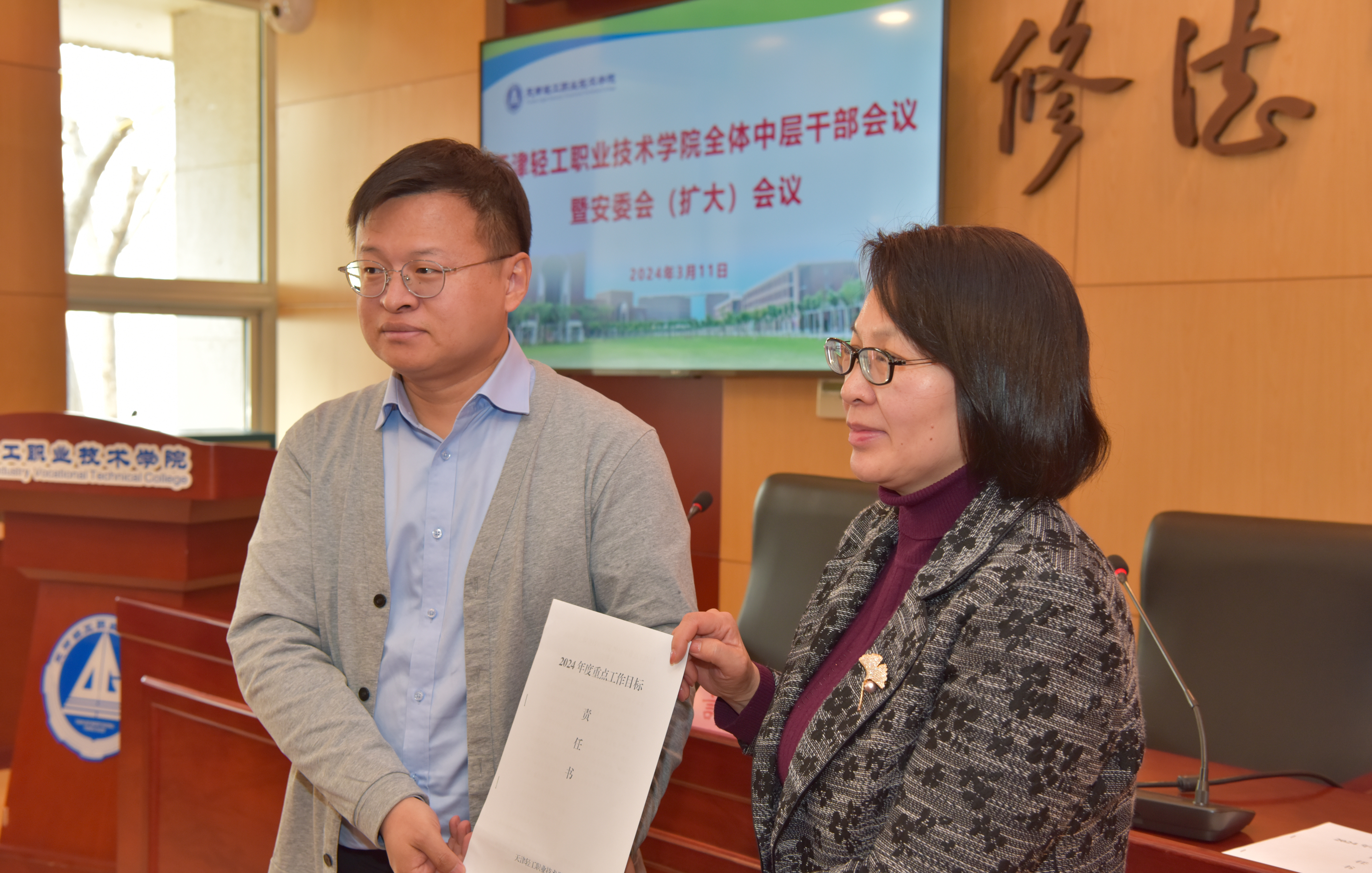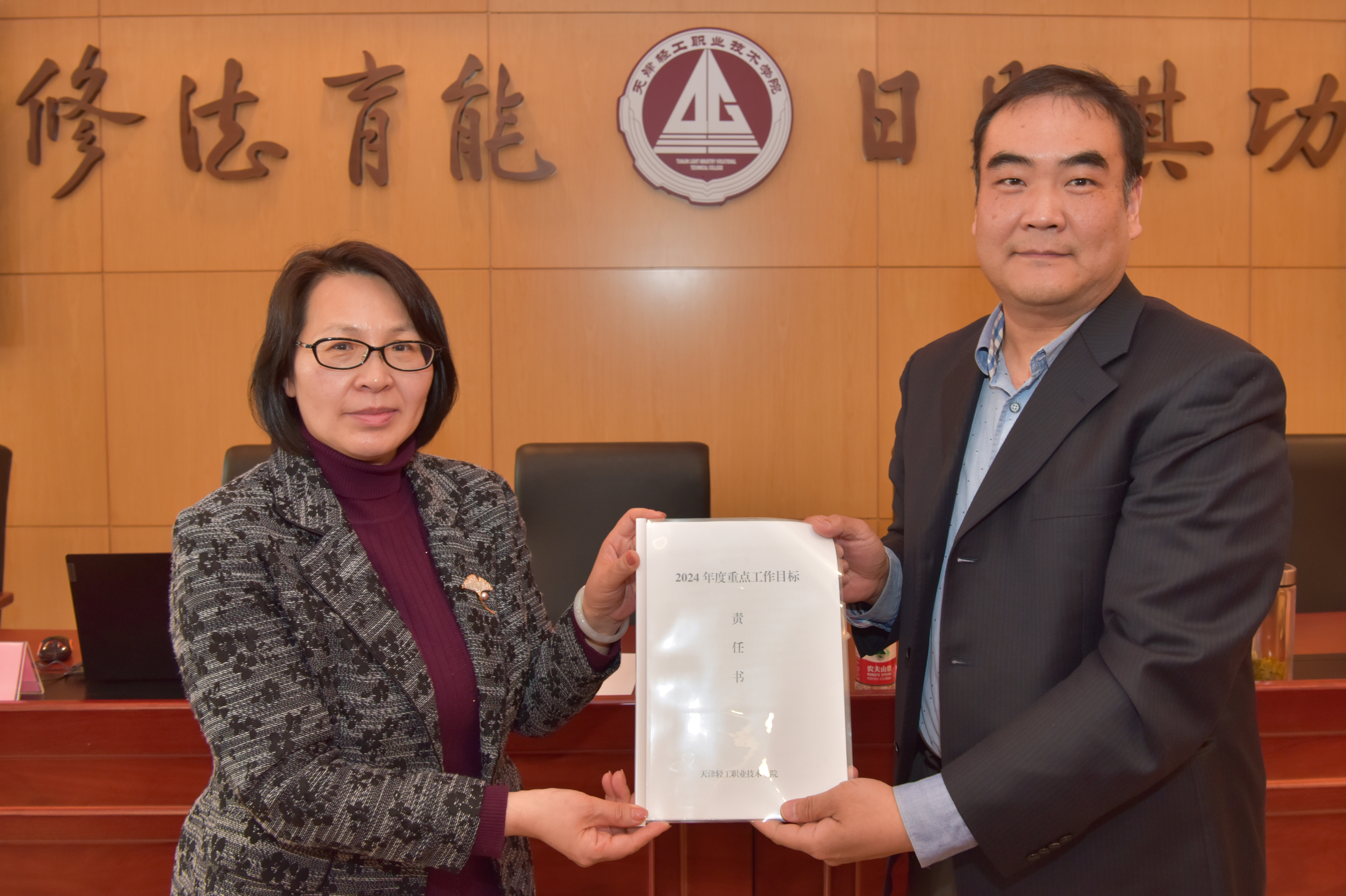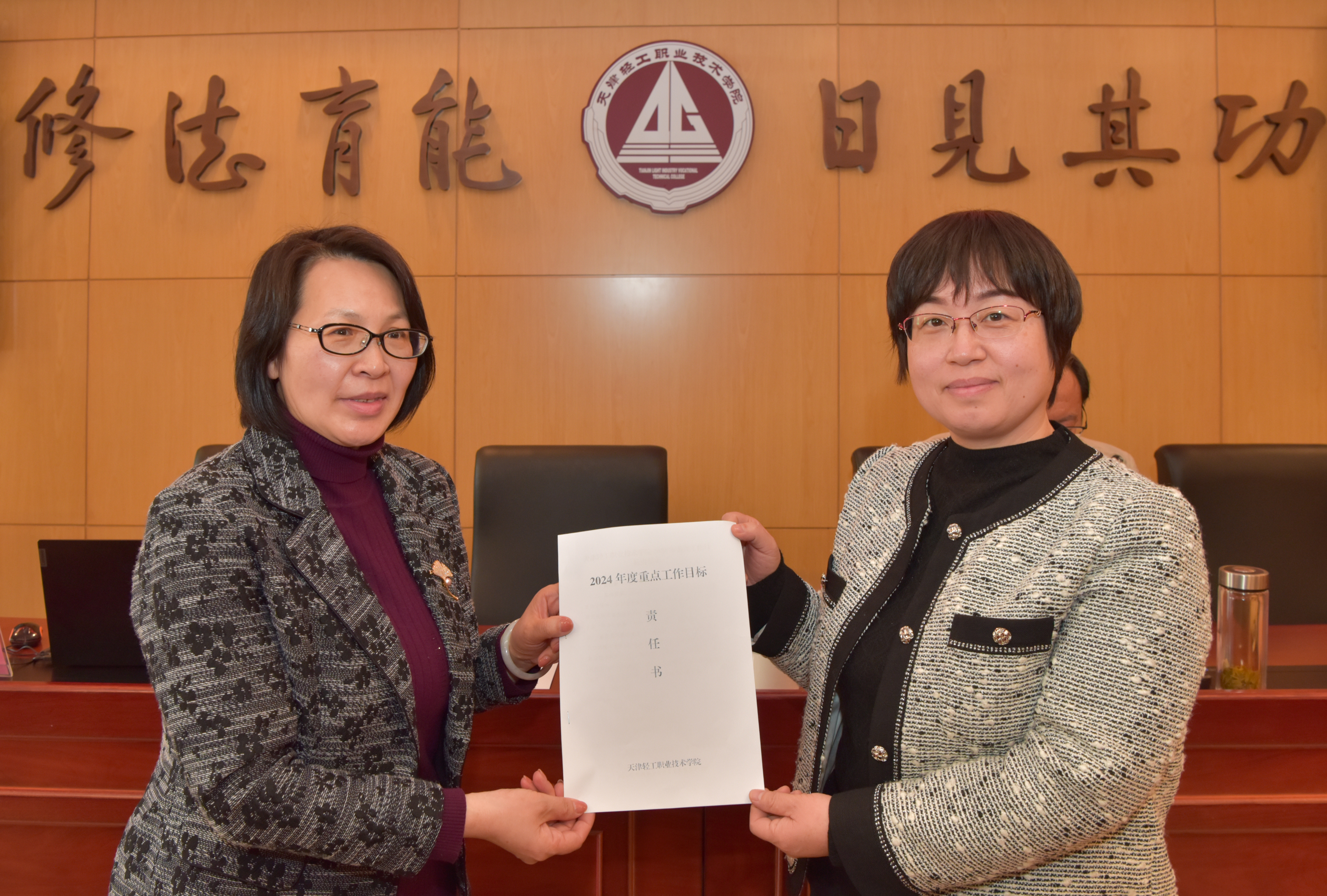 会议第三阶段,由党委副书记、副院长李子铮主持。党委办公室主任陈伟作2024年重点任务分工说明及教代会各代表团意见反馈安排。二级学院、部门代表向学院递交2024年重点工作目标责任书。财务部部长王丽云作2024年学院财务收支情况说明。 网络安全和信息化办公室主任姚策作学院信息化工作部署。质量管理中心副主任霍琳作“双高”验收准备及迎检工作部署。副院长刘悦凌作赴德、瑞考察情况报告。