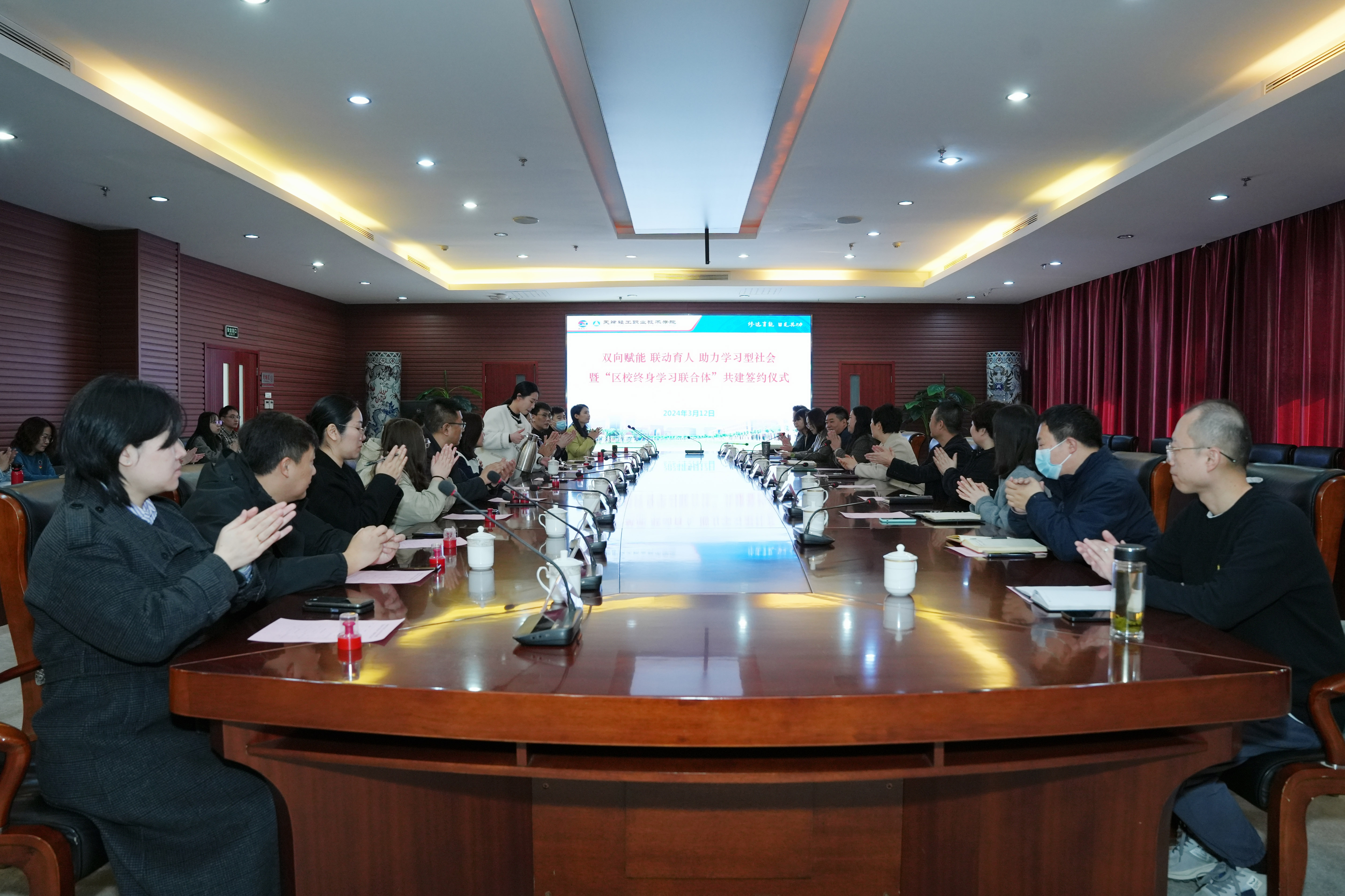 为深入学习贯彻党的二十大精神,落实党的教育方针,坚持立德树人根本任务,把思想政治教育贯穿教育全过程,推动思政小课堂与社会大课堂相结合,持续扩大终身教育资源供给,增强社区教育发展活力,提升高校社会服务能力的总体要求,3月12日,我院与天津市津南区辛庄镇政府在学院第一会议室举行“区校终身学习联合体”共建签约仪式。