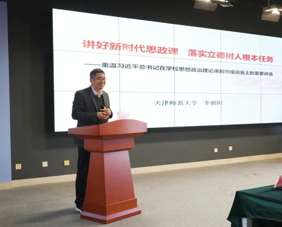 座谈会伊始,李朝阳教授以《讲好新时代思政课,落实立德树人根本任务》为主题,全面梳理和回顾了习近平总书记在学校思想政治理论课教师座谈会上的重要讲话,提出讲好新时代思政课要坚持做到“八个相统一”,持续推进大中小思政课一体化,在“讲准”的基础上讲好思政课,使之成为既有吸引力又有后劲的关键课程,实现教师用心教和学生用心悟的有机统一。