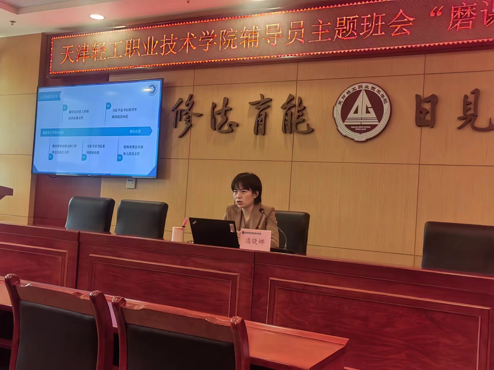 我院特邀请天津市优秀辅导员潘晓娜和天津市首批辅导员工作室石榴籽工作室主持人胡修茵两位老师到现场分享经验。   潘晓娜发表了题为《让信仰照亮青年——从大赛谈职业院校辅导员工作的思考》的经验分享,她以大赛为抓手,根据辅导员工作理论、辅导员工作导向、工作方法三方面,提出要站好第一课堂,守住第二课堂,以理想信念教育为引领,培养堪当民族复兴大任的时代新人,更要脚踏实地,在围绕学生、关照学生、服务学生中成为学生成长成才的人生导师和健康生活的知心朋友。