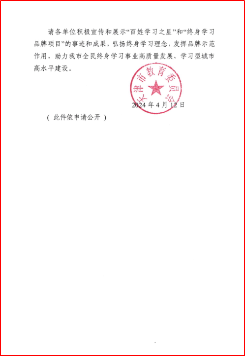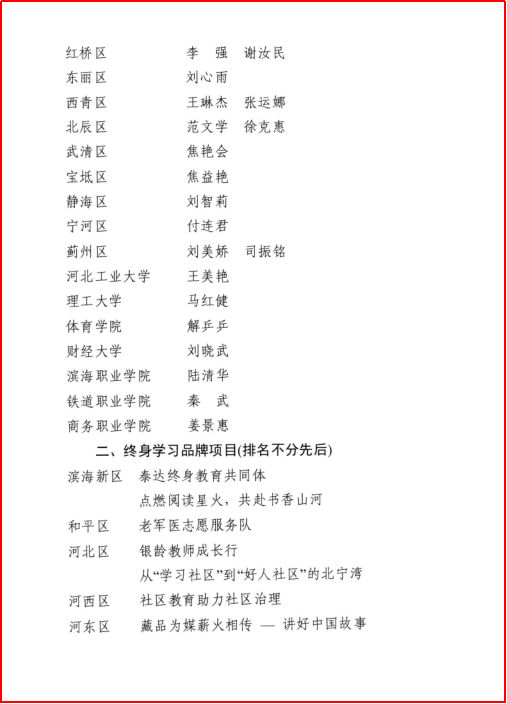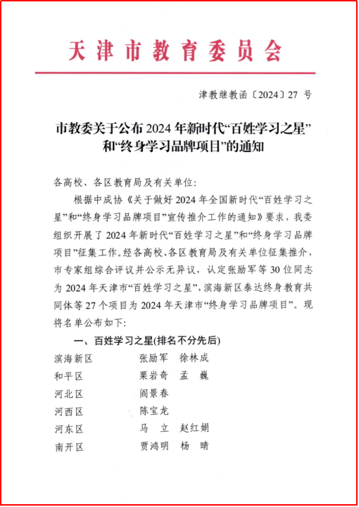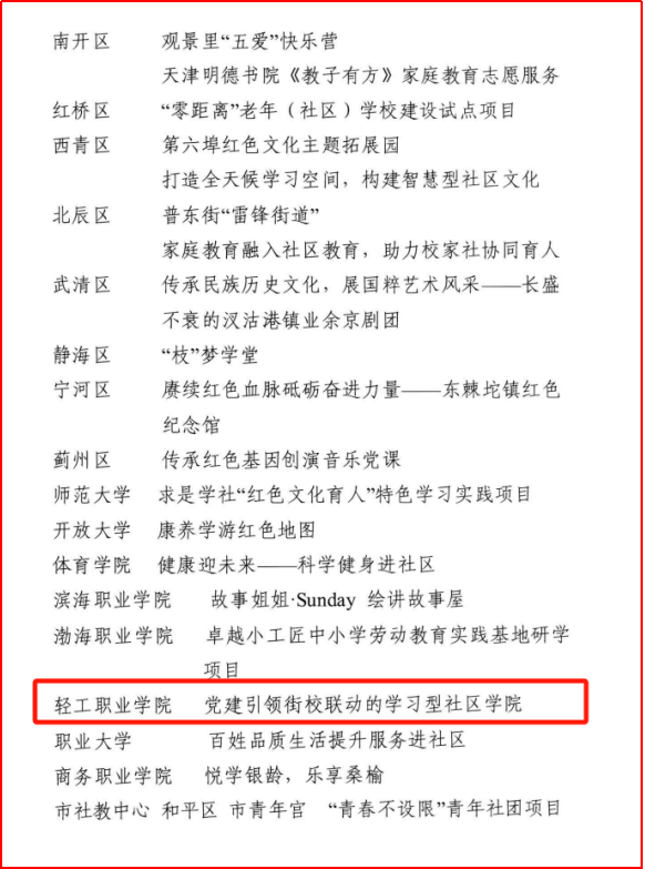 近日,根据中成办《关于做好2024年全国新时代“百姓学习之星”和“终身学习品牌项目”宣传推介工作的通知》和《市教委关于征集推介2024年新时代“百姓学习之星”和“终身学习品牌项目”宣传推介工作的通知》的要求,通过天津市教育委员会评议推介,由我院报送的“党建引领街校联动的学习型社区学院”项目荣获2024年天津市“终身学习品牌项目”。   “党建引领街校联动的学习型社区学院”项目是学院贯彻落实《关于推进学习型城市建设的意见》文件精神,联合社区共建党建引领街校联动的学习型社区学院,实施社区课堂,携手推进学习型城市建设,服务区域发展的一项重要举措。     自2019年以来,学院通过与社区党支部党建共建、开展社区课堂和社区文化活动等,先后与津南区葛沽镇泽水园、海棠街知香园、辛庄镇金地艺境社区及河北区望海楼街金辰园社区等4个社区共建社区学院,探索出“街校联动 党建引领 构建学习型社区学院”的社区教育模式,助力推动学习型社区建设。    未来,学院将发挥项目成果的示范引领作用,推广品牌经验,持续加强社区教育创新研究和实践,根据各社区居民综合情况设计社区课堂课程,手把手地将生活中的知识和技能教授给社区居民,服务社区居民,推进学习型社区、学习型城市建设。