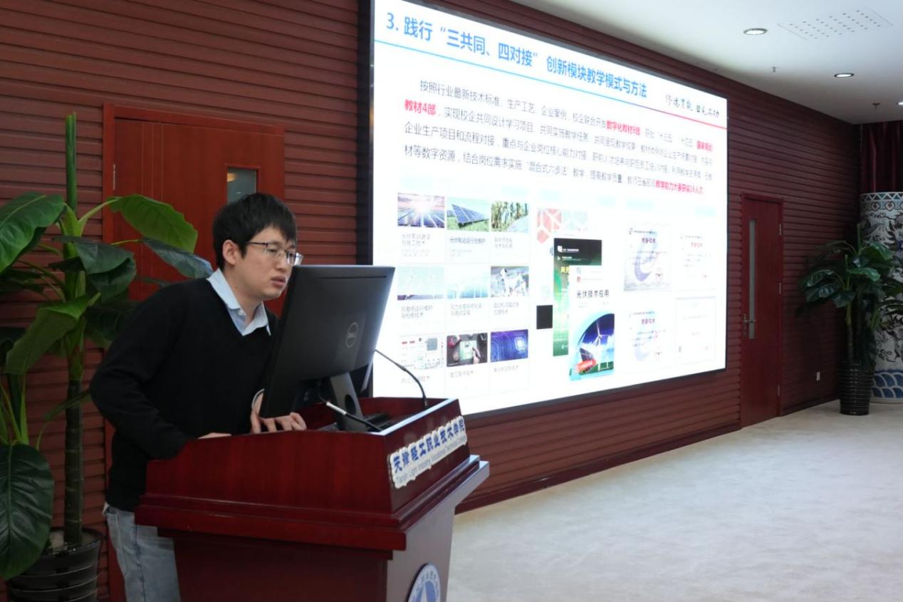 电子信息与自动化学院实岗锻炼干部崔立鹏就“双高”光伏工程技术专业群建设情况与发展方向进行汇报。光伏工程技术专业群经过“双高”5年建设,共取得标志性成果共41项,其中国家级25项,省部级15项,在创新人才培养模式、打造优质课程资源、践行创新模块教学模式、建设良好师德师风教学团队、举办国内外技能大赛等方面都取得了丰硕成果。崔老师表示,当前学校正着力推进碳中和新能源开放性产教融合实践中心建设,致力在提供技术服务、开展新能源设备检测、实现真实生产的基础上开展实践教学,并承接企业员工社会培训,为天津市经济发展做出贡献。