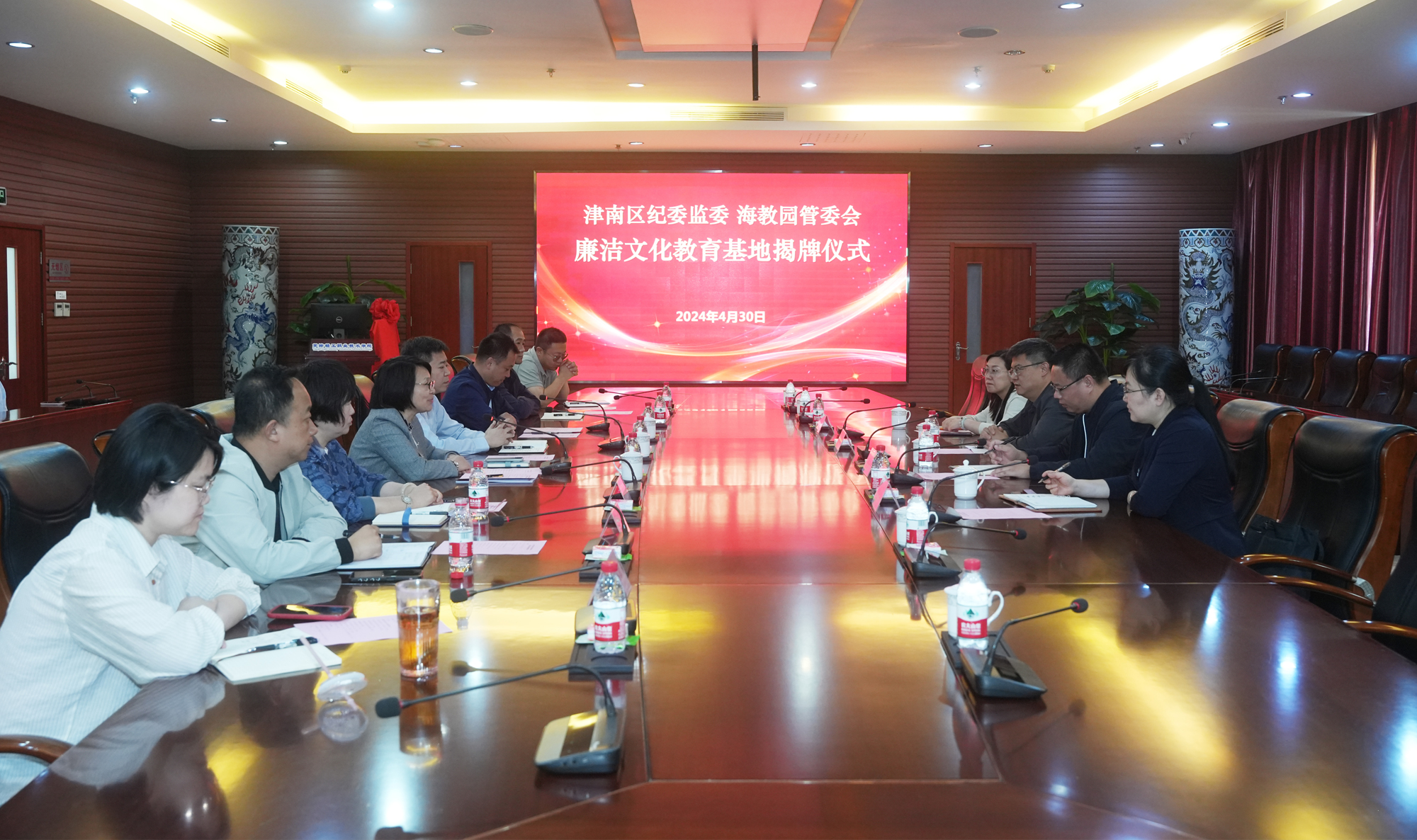 座谈交流后,津南区纪委监委、海教园管委会领导和渤轻集团纪委、学院领导共同揭牌。前期,津南区纪委监委、海教园管委会都到学院“廉韵轻风”中华传统廉洁文化长廊开展了参观调研。