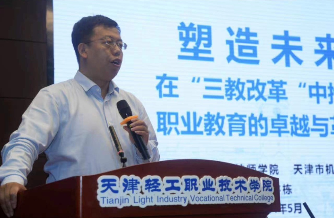 天津市机电工艺技师学院院长梁宇栋以《塑造未来:在“三教改革”中推动职业教育的卓越与革新》为主题,从加强党建和课程思政、深化校企合作、借助技能大赛、建设数字化校园、推动专业项目建设五个方面分享了学校助推“三教改革”经验,同时也指明学校未来将积极“赋能”教师,“升级”教材,“激活”教法,在提升学校内涵建设和教师素养等方面进行了经验分享。    天津市机电工艺技师学院院长梁宇栋