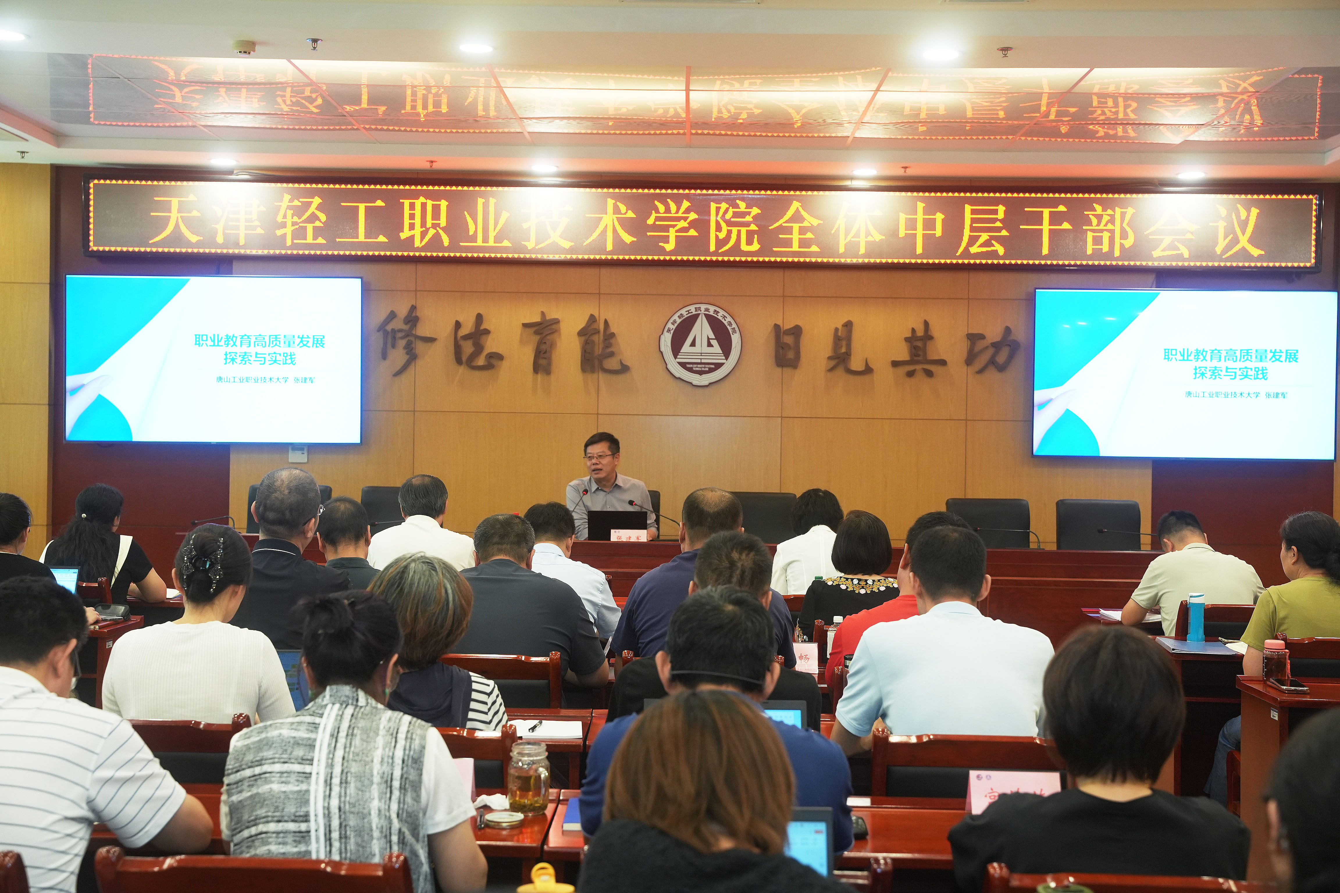 会议第二阶段,由党委副书记、院长李云梅主持。学院邀请了唐山工业职业技术大学党委副书记、校长张建军作“职业教育高质量发展探索与实践”的专题讲座。张校长从双高建设和本科层次职业学校建设两方面展开,重点从政策依据、建设背景、思考实践、未来规划四部分内容深入浅出地分享了唐山工业职业技术大学的升本经验和“新双高”申报准备的心得。