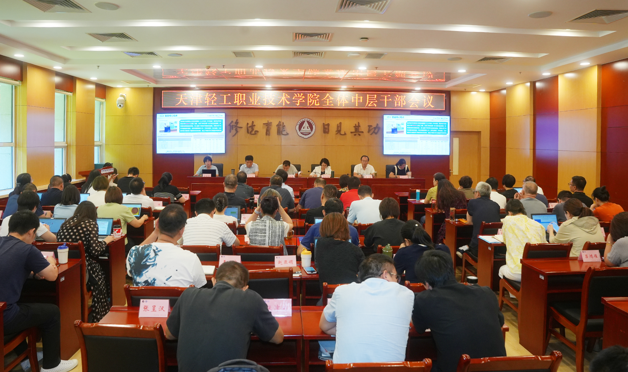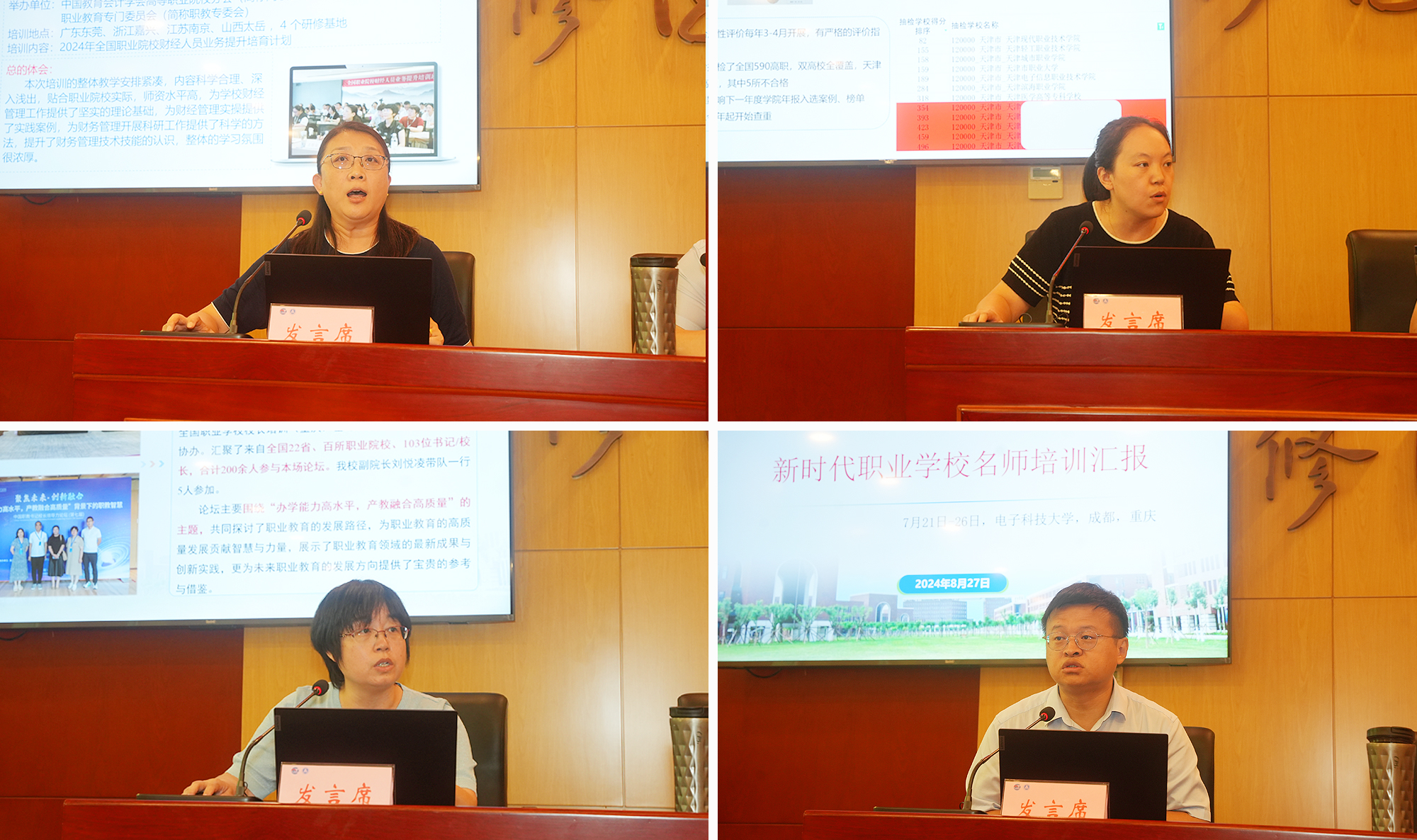 会议第一阶段,由党委副书记、副院长李子铮主持,由暑假期间外出培训的中层干部代表财务部部长王丽云、质量管理中心副主任霍琳、经济管理学院院长只井杰、电子信息与自动化学院院长姚嵩作学习经验分享。