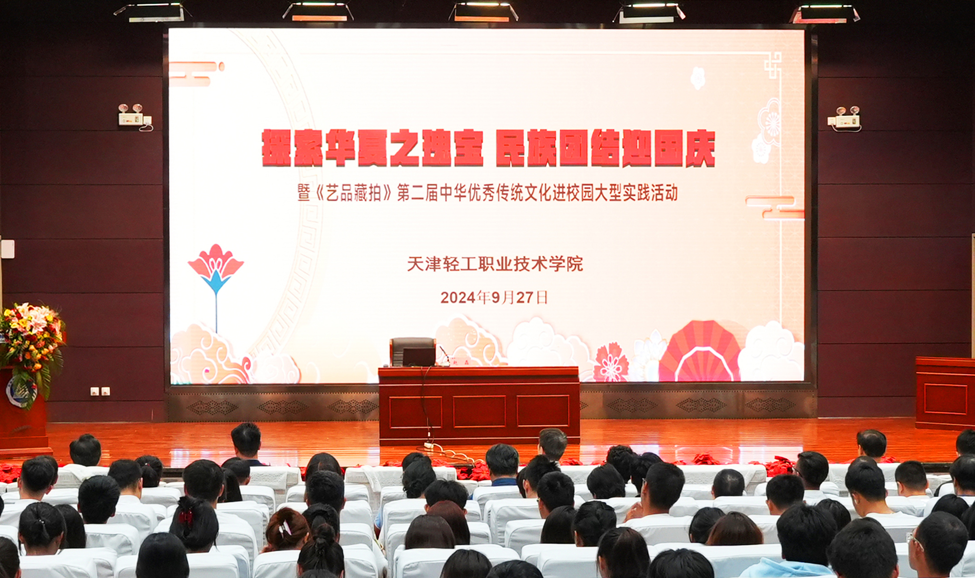 为庆祝中华人民共和国成立75周年,9月27日,我院再次携手天津电视台文艺频道《艺品藏拍》栏目举办“探索华夏之瑰宝 民族团结迎国庆”暨《艺品藏拍》第二届中华优秀传统文化进校园大型实践活动。天津市津南区政协副主席王华,天津渤海轻工投资集团党委副书记、工会主席马强,天津中华职业教育社常务副主任关章军,天津市津南区区委统战部副部长刘洪涛,天津海河传媒中心文艺频道副总监彭靖,海河教育园区管委会相关领导,学院党委副书记、院长李云梅,党委副书记、副院长李子铮以及相关文化单位,来自新疆和田职业技术学院、甘肃工业职业技术学院、西藏昌都职业技术学校、天津美术学院、天津财经大学等十多家兄弟院校,天津教育报等多家新闻媒体,我院近五百名师生参加了活动。