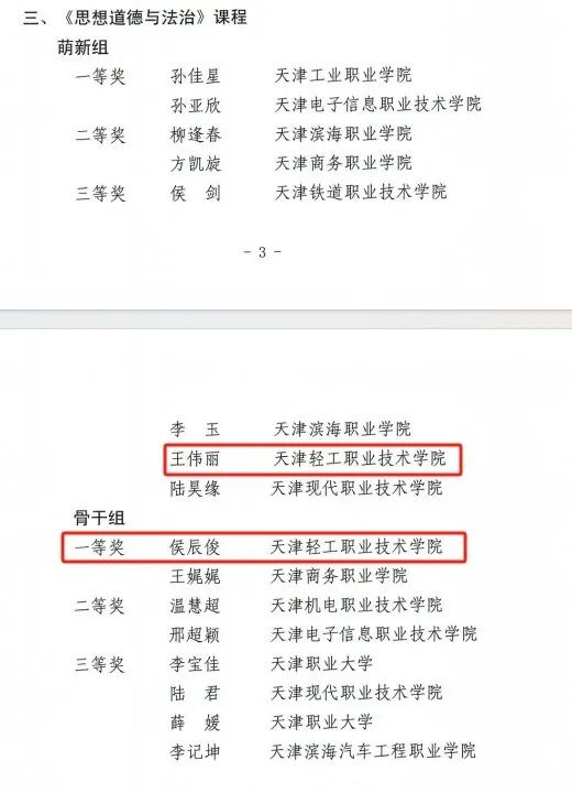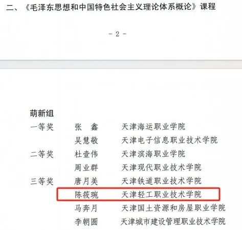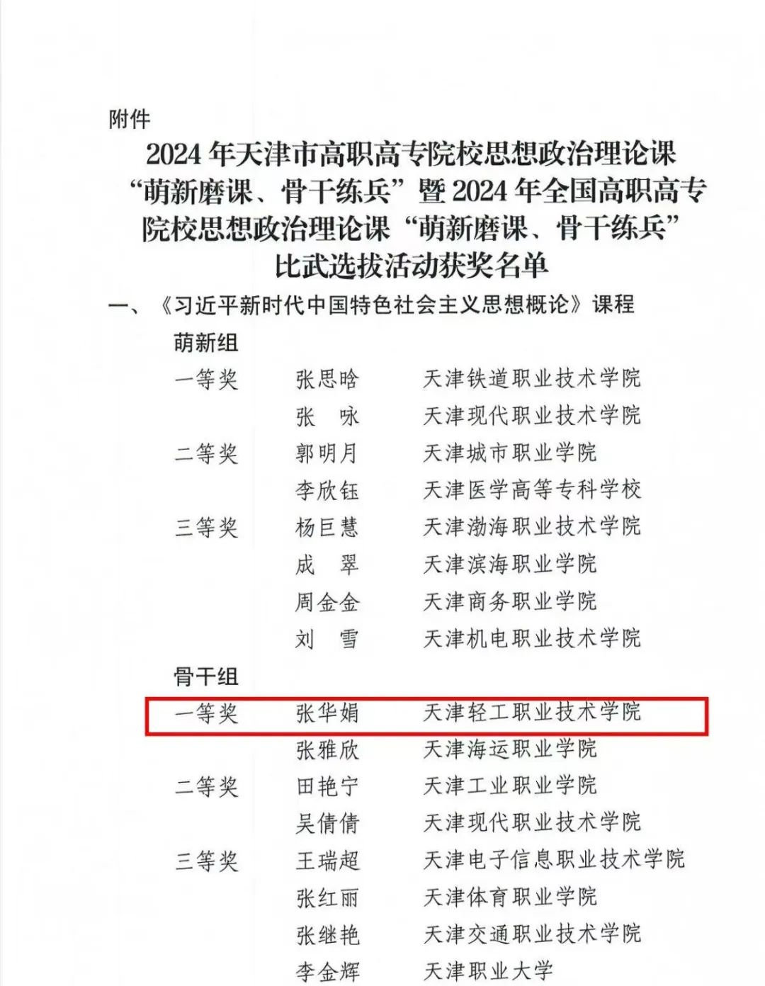 近日,天津市高职高专院校思想政治理论课“萌新磨课、骨干练兵”暨2024年全国高职高专院校思想政治理论课“萌新磨课、骨干练兵”比武选拔活动发布获奖名单。我院思政课教师张华娟、侯辰俊、王伟丽、陈筱琬分别在《思想道德与法治》《毛泽东思想和中国特色社会主义理论体系概论》《习近平新时代中国特色社会主义思想概论》三门课程的骨干组和萌新组中斩获一等奖2项,三等奖2项。此次获奖是我校高度重视思政课教学改革、重视教学团队建设结出的又一硕果,对学校持续推动思政课建设内涵式发展具有重要意义。