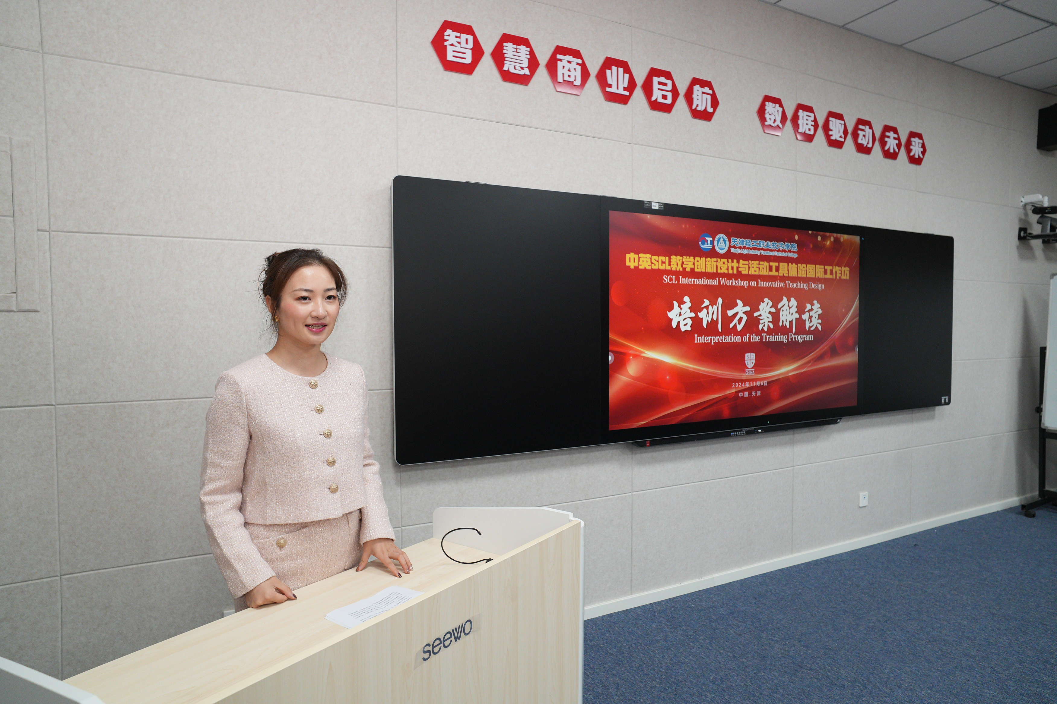 AQCET英国教育与教学质量控制协会中国区首席执行官洪颖颖博士在致辞中介绍了AQCET英国教育与教学质量控制协会在诸多项目中取得的累累硕果,并对此次SCL培训任务方案进行详细的解读,她表示,希望教师们能够通过此次培训在未来课堂教学上有所突破,为培养高质量技术技能人才奠定坚实的基础。